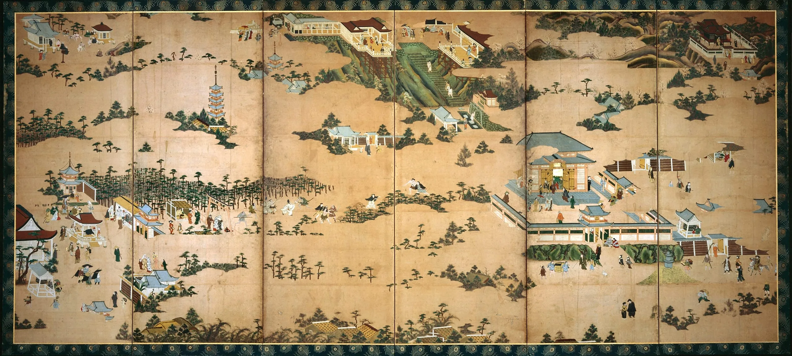 Panoramic views of Kyoto, the capital of Japan from 792 to 1868, were first painted on folding screens in the sixteenth century. Called Rakuchu rakugaizu(literally, "views in and around the capital"), the screens often depict genre scenes such as storytelling, the selling of food, the serving of tea, and occasionally musical performances, mothers comforting their children, or even servants sleeping. Invariably, these scenes include natural features such as mountains and rivers as well as important identifiable structures such as Buddhist temples and Shinto shrines. The buildings depicted can conclusively determine the date of the screens: Rakuchu rakugaizu were meant to be literal representations of the primary sites of the capital, portraying buildings that were extant at the time the screen was created.