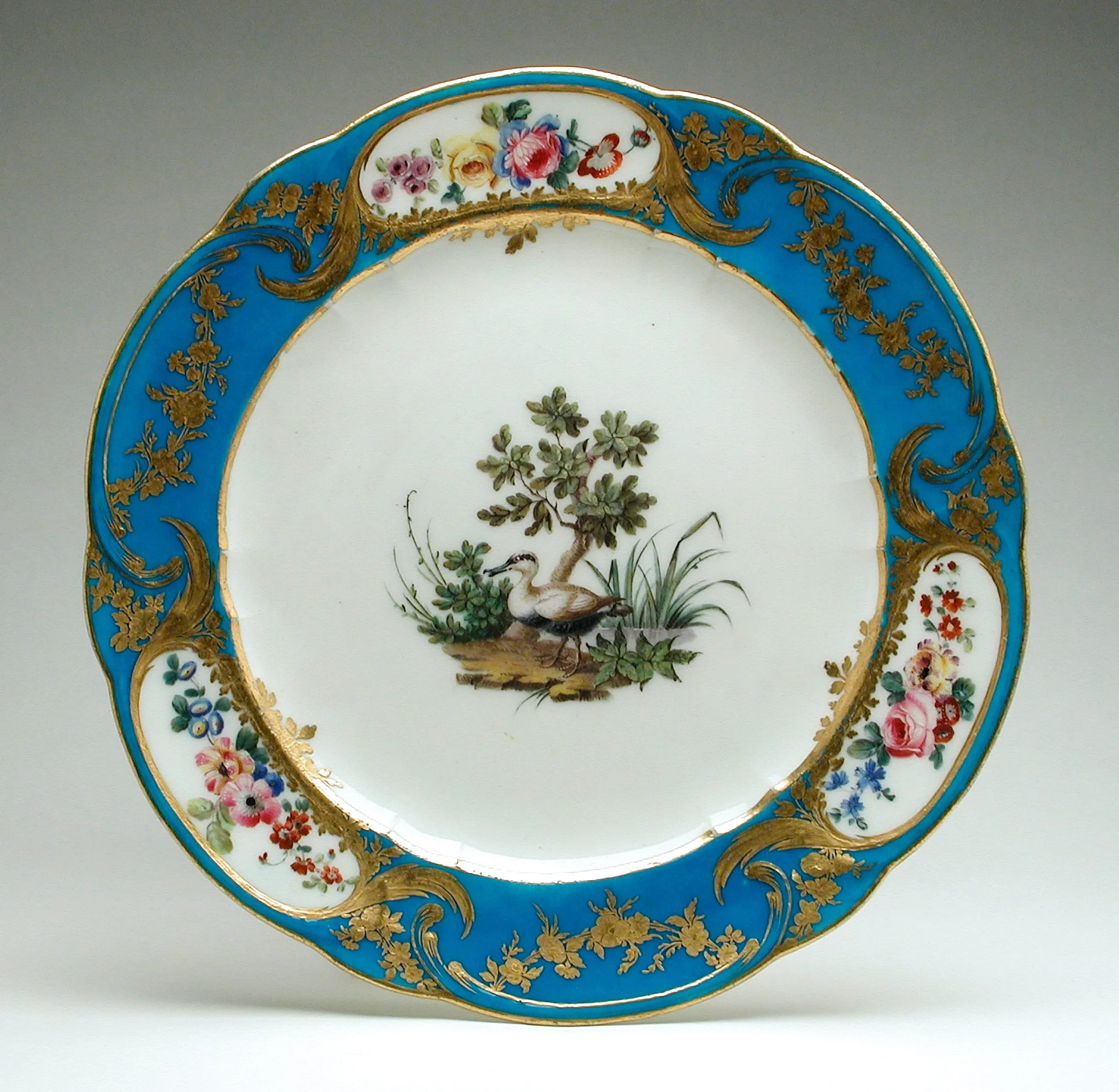 Porcelain plate with turquoise blue border, gilded scrollwork, three white cartouches painted with floral bouquets, and a central scene of a wading bird among grasses and a small tree