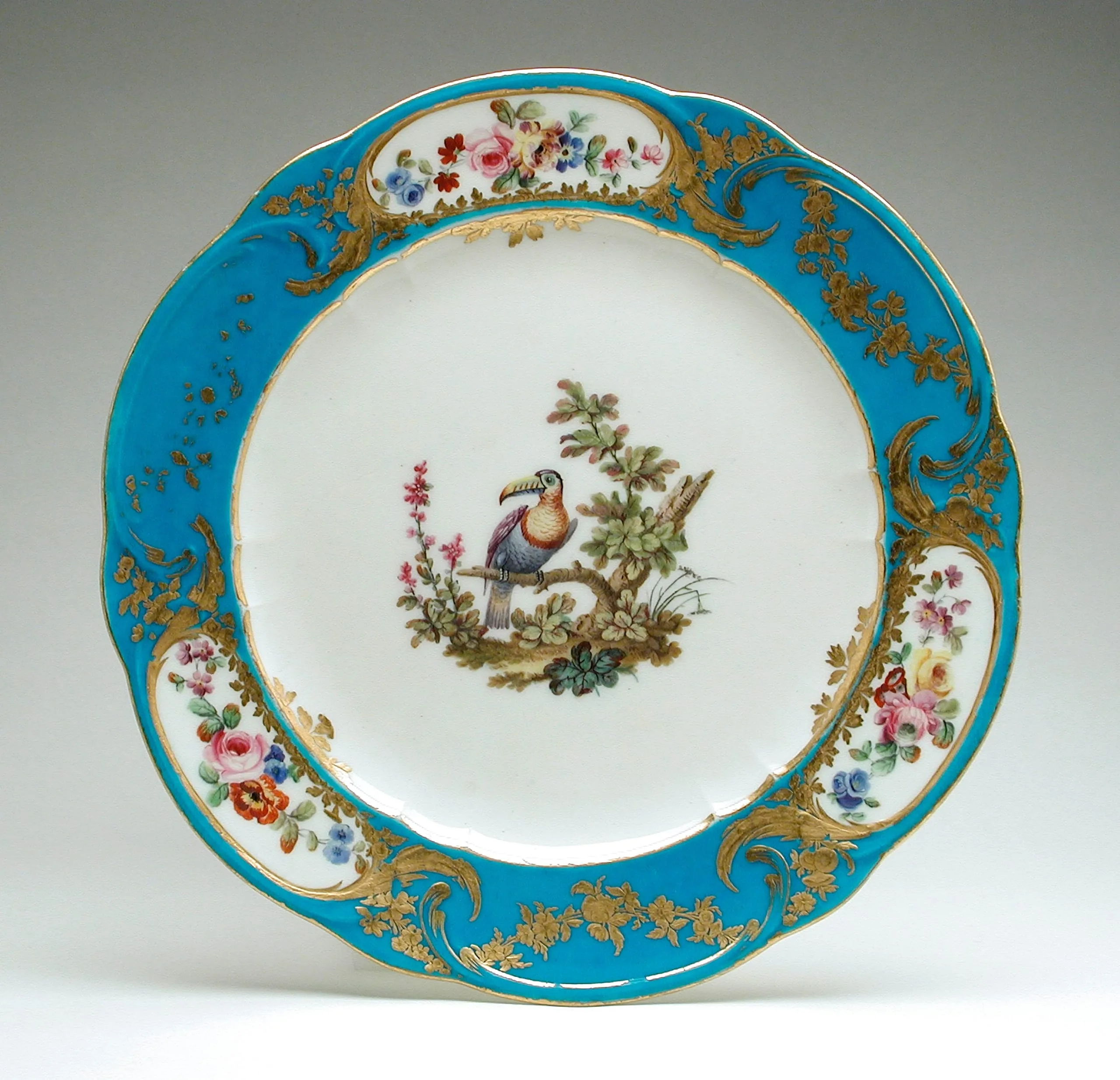 Porcelain plate with scalloped rim, turquoise border with gilded rococo scrollwork and three floral cartouches, white central well painted with a perched toucan amid flowering branches