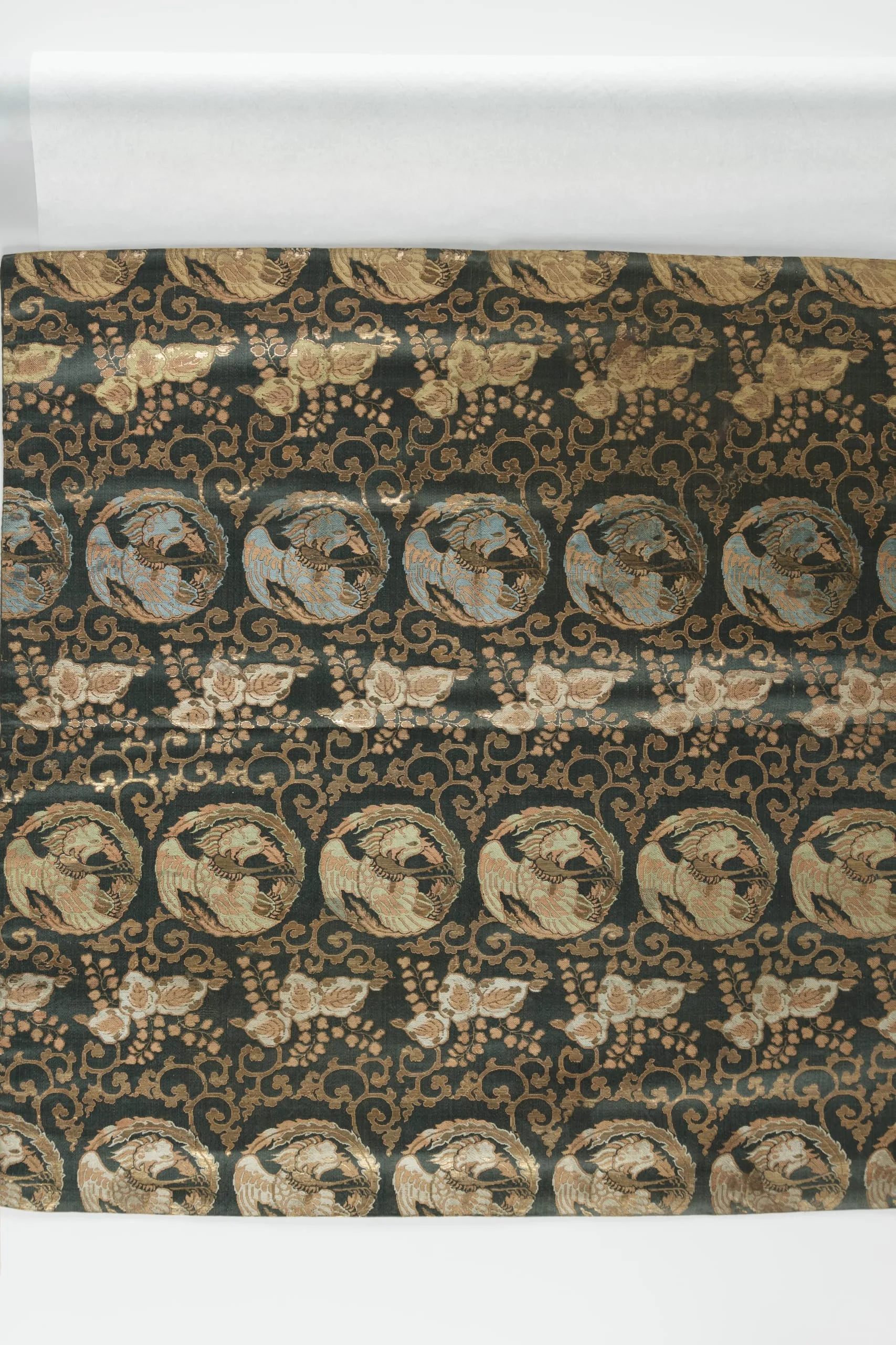 Woven textile with deep charcoal-green ground, repeating circular medallions enclosing birds with outstretched wings, surrounded by gold scrolling vines and small floral motifs