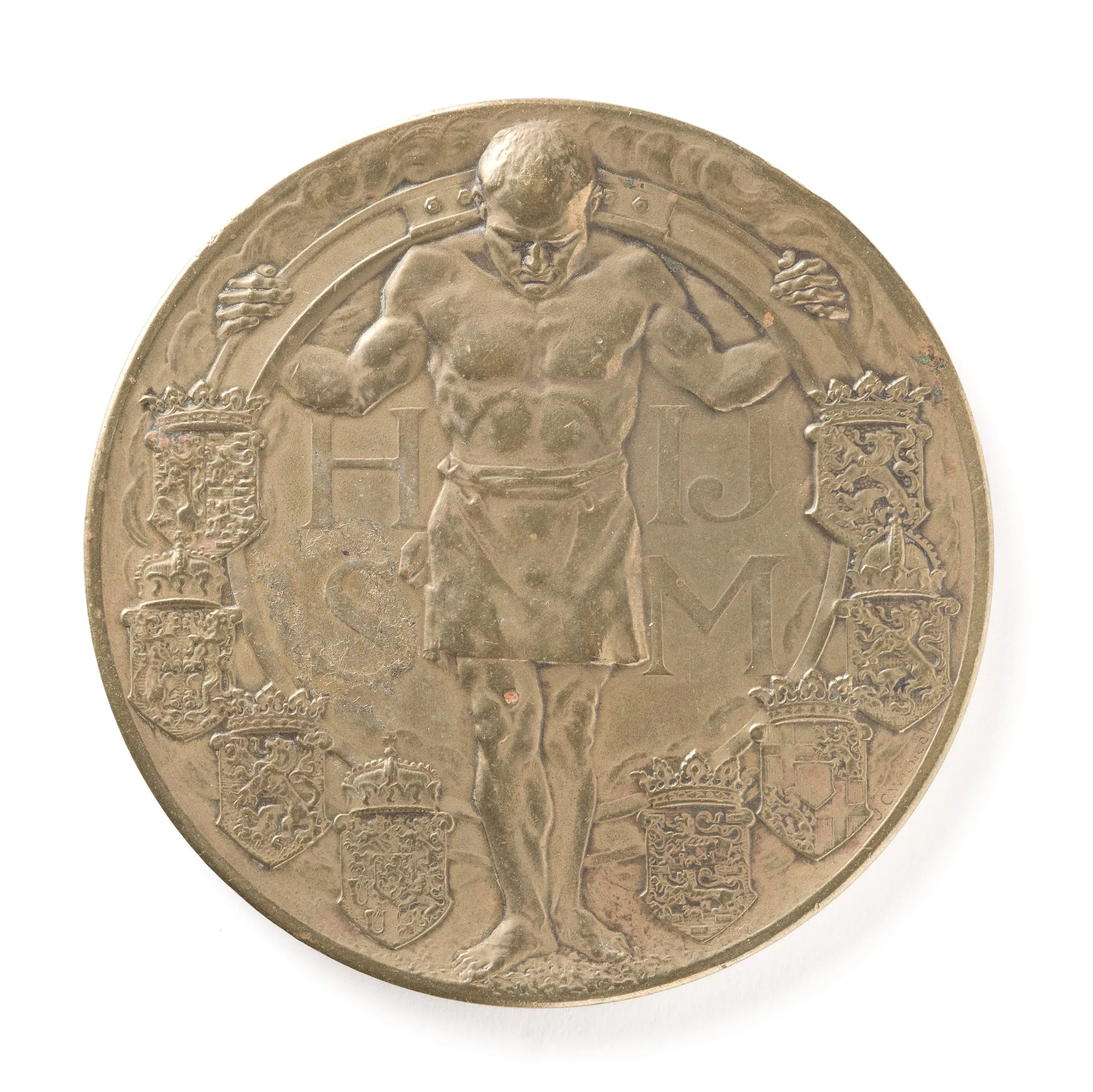 Circular bronze medal with high-relief figure of a muscular, bare-chested man straining against a bar, surrounded by four heraldic shields and the letters H, IJ, S, M