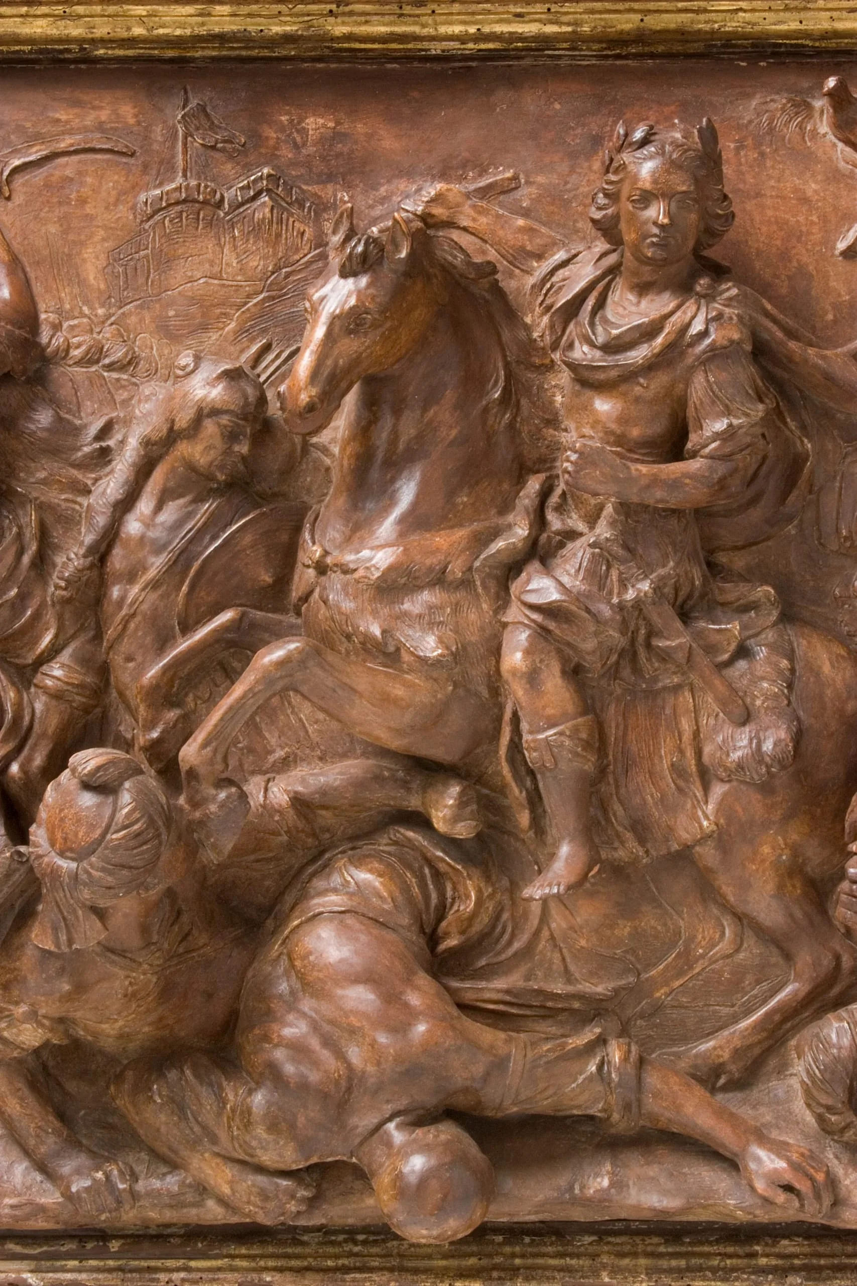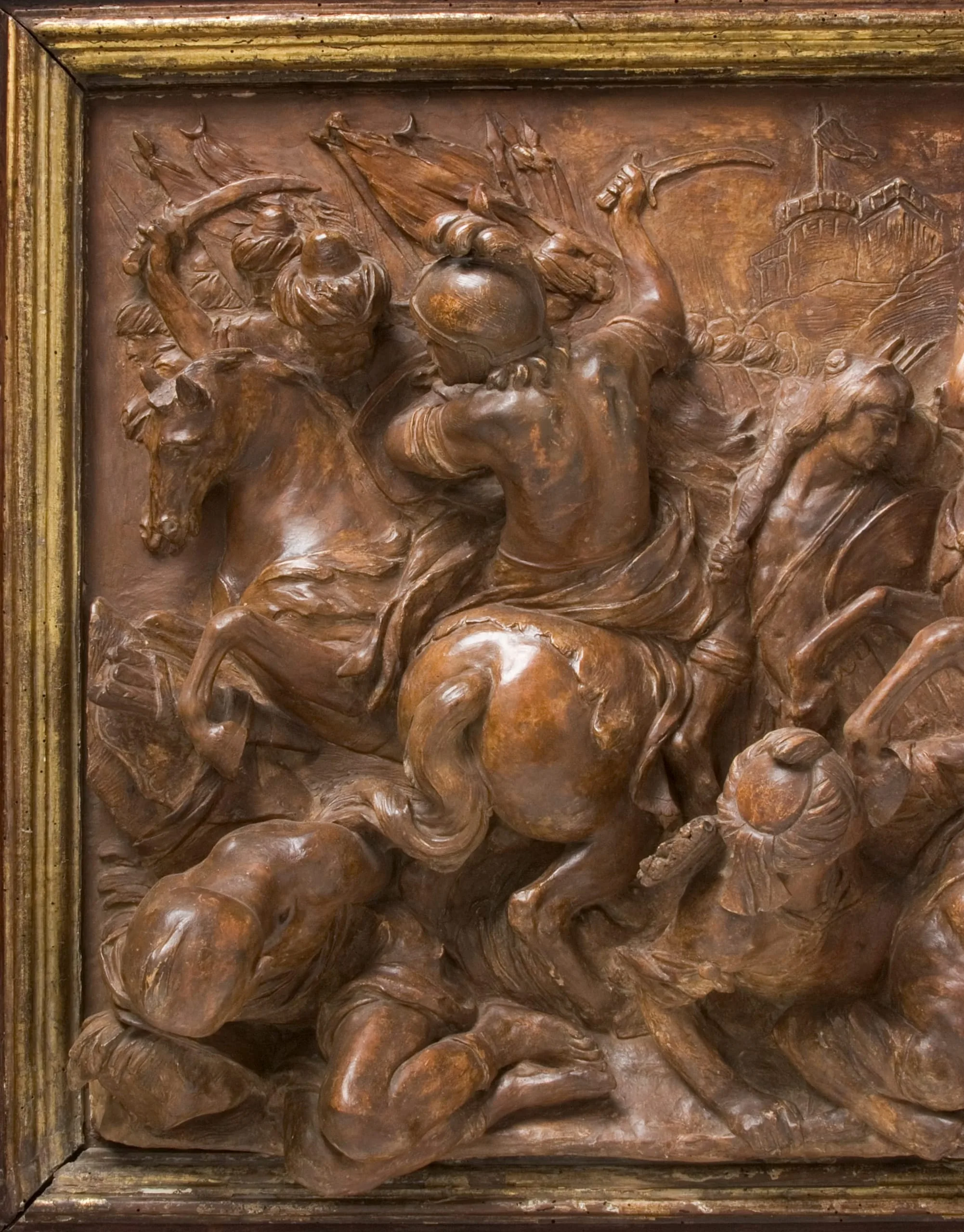 - Patinated earthenware with painted and gilded wood frame