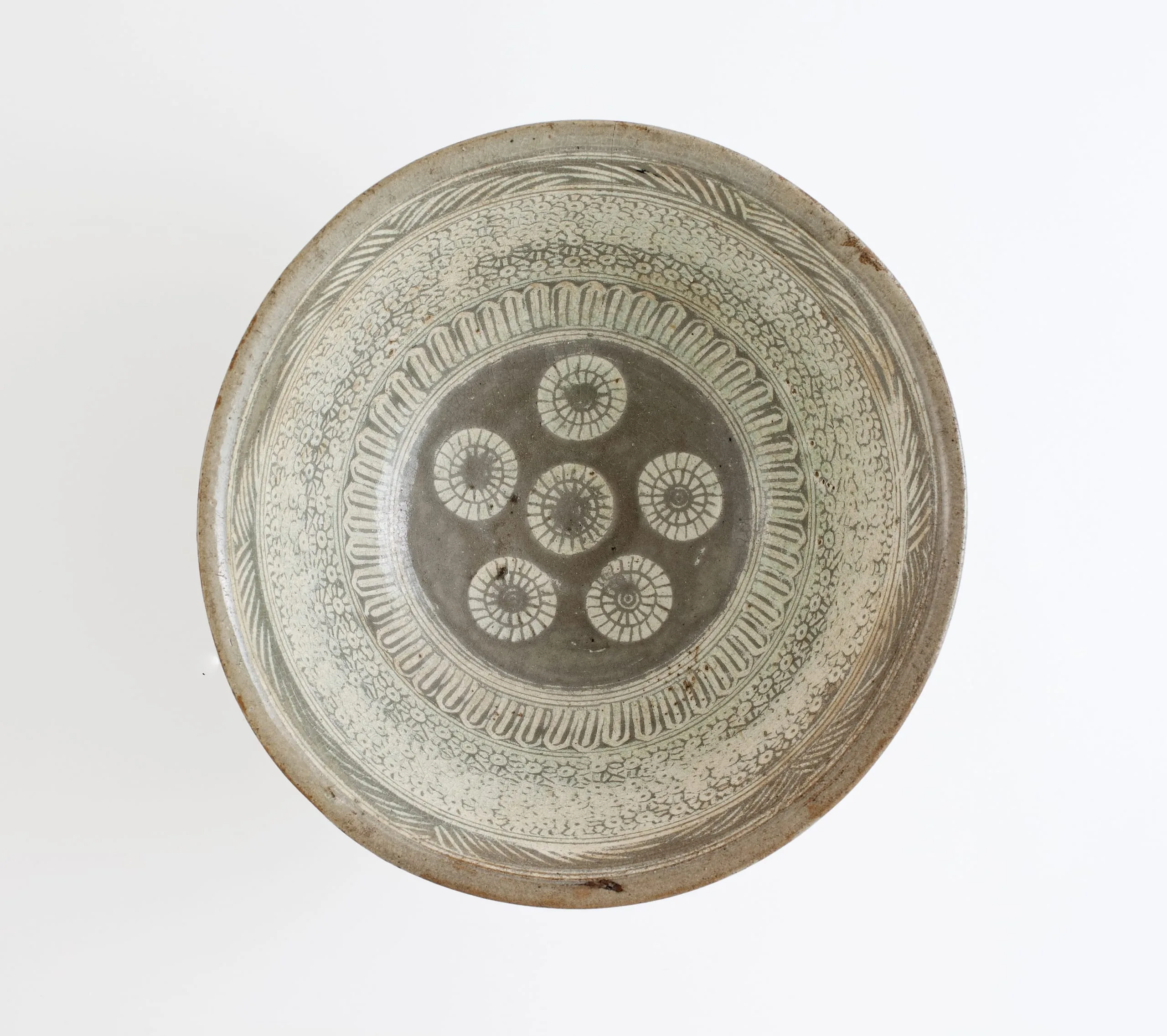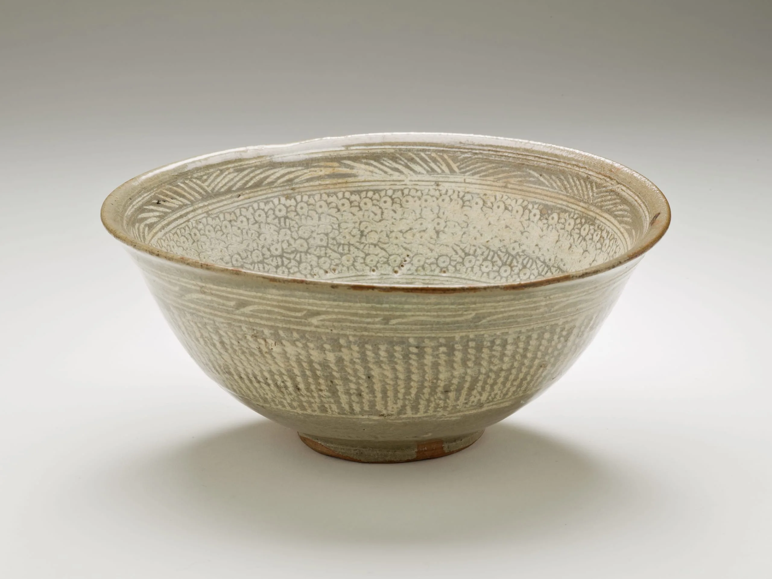 - Buncheong ware; Wheel-thrown stoneware with stamped, incised and slip-filled decoration and pale green glaze