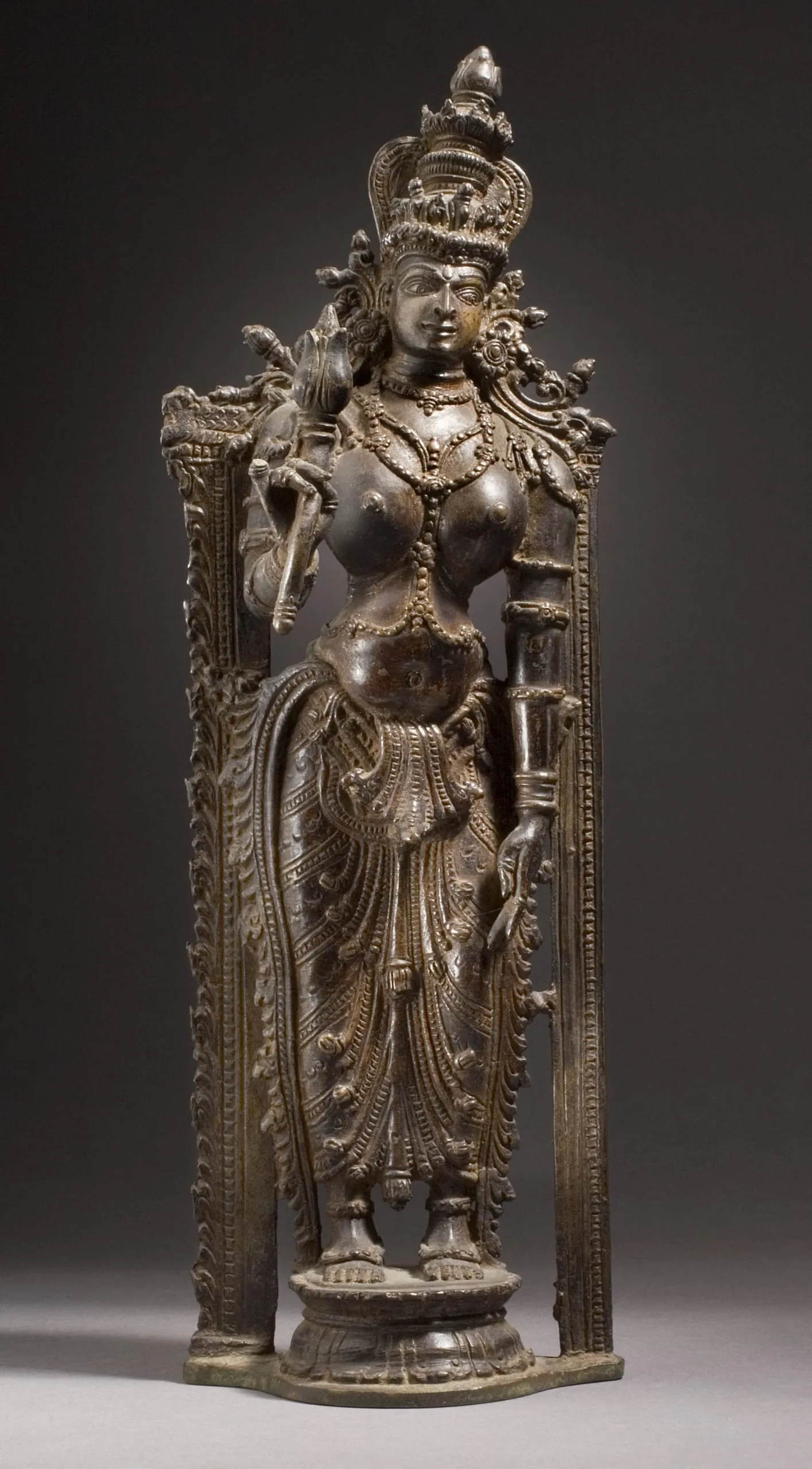 This exceptional copper alloy (bronze) sculpture from the modern Indian state of Kerala represents the Hindu goddess Shri Lakshmi, the consort of the god Vishnu. The two-armed goddess stands on a lotus pedestal within a mandorla that extends to her shoulder height. Lakshmi wears a tall crown with a lotus bud finial, splayed cascading locks adorned with floral terminals, and a small nimbus shaped like a pipal leaf or heart. She is profusely adorned with jewelry and wears a striped skirt with cascading pleats and a flaring sash. Her physiognomy includes large open eyes with carefully delineated eyelids and eyebrows, an aquiline nose, pointed chin, closed lips with a slight smile, and a devotional marking on her forehead. She carries an attribute with a lotus bud in her right hand. The image was once part of a triad, likely formed with Vishnu and another of his wives. This is indicated by several iconographic clues: the slight tilt of the goddess’ head and vertical axis towards the now-missing central figure of Vishnu, her eyes gazing to the left towards Vishnu, and the empty socket on the back of the sculpture into which the tang of a separately cast halo (prabhamandala) that united the three images. As postulated by Mary Beth Coffman Heston (Archives of Asian Art, 2004), the sculpted and painted figural types of Kerala demonstrate a hyperextension of the lower back and full breasts thrust forward that replicate the distinctive physique of Kerala’s Kathakali dance performers.