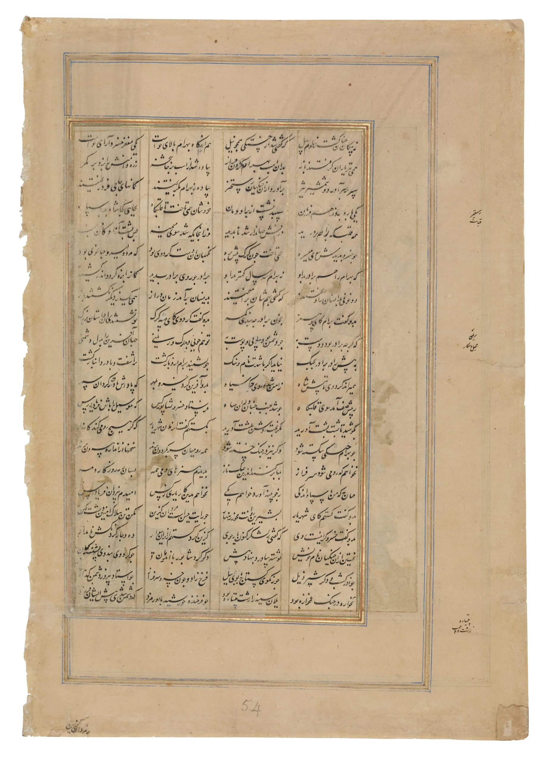 This illustrated page from a manuscript of the Iranian national epic, the Shahnama, depicts a contest between the Sasanian monarch Shah Khusraw Parviz (Khusraw II, r. AD 590–628) and a would-be usurper, Bahram Chubina. The protagonists, who competed for the Iranian throne, are both crowned. Bahram, the superior warrior, advances on foot toward a group of archers directed by Khusraw. One of Bahram's men has fallen to the ground, foreshadowing Khusraw's eventual victory with the aid of the Byzantine army.