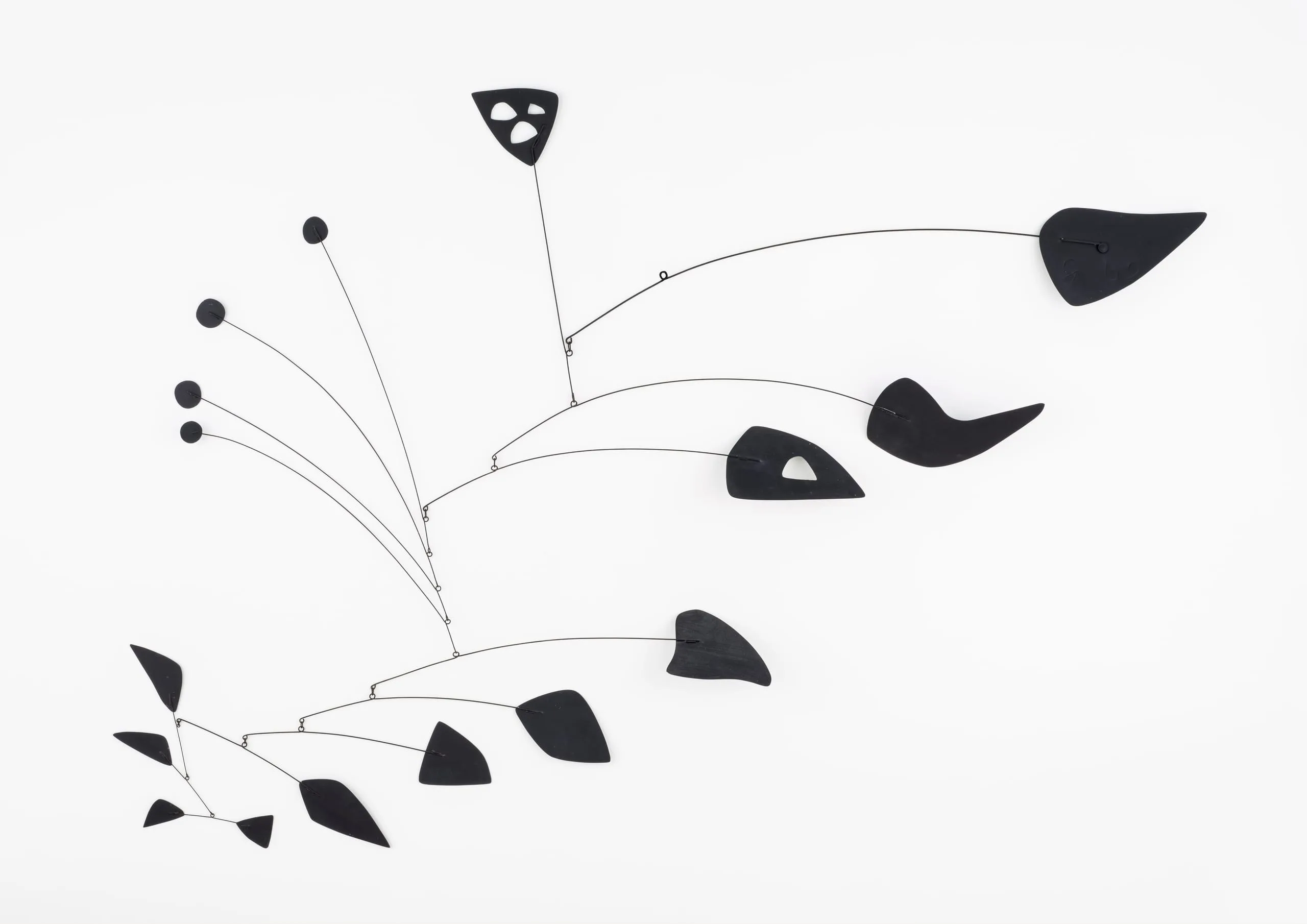 In the early 1930s, Calder began work on a series of innovative sculptures with a kinetic dimension. When they were first showed at the Galerie Vignon in Paris, Marcel Duchamp baptized them “mobiles” because in French the word alludes to both movement and motivation. The very first mobiles were motorized, but by 1933, Calder had abandoned that idea and allowed his counter-weighted construction to move naturally with the changing atmosphere around them. Critics linked these works to the artist’s interest in early astronomical models and mechanical toys. However, the artist himself spoke about these sculptures in relationship to abstract painting, saying that his mobiles were an abstract representation of the ability of living things to react. This concept manifested his critique that the art of his day had become too static in form to reflect the essential place of movement in the modern world. Mobility had always been a central tenet in Calder’s work from the early circus figures he used in performances, to his wire and bronze sculptures and even his later “stabiles” sculpture – which implied movement by default.