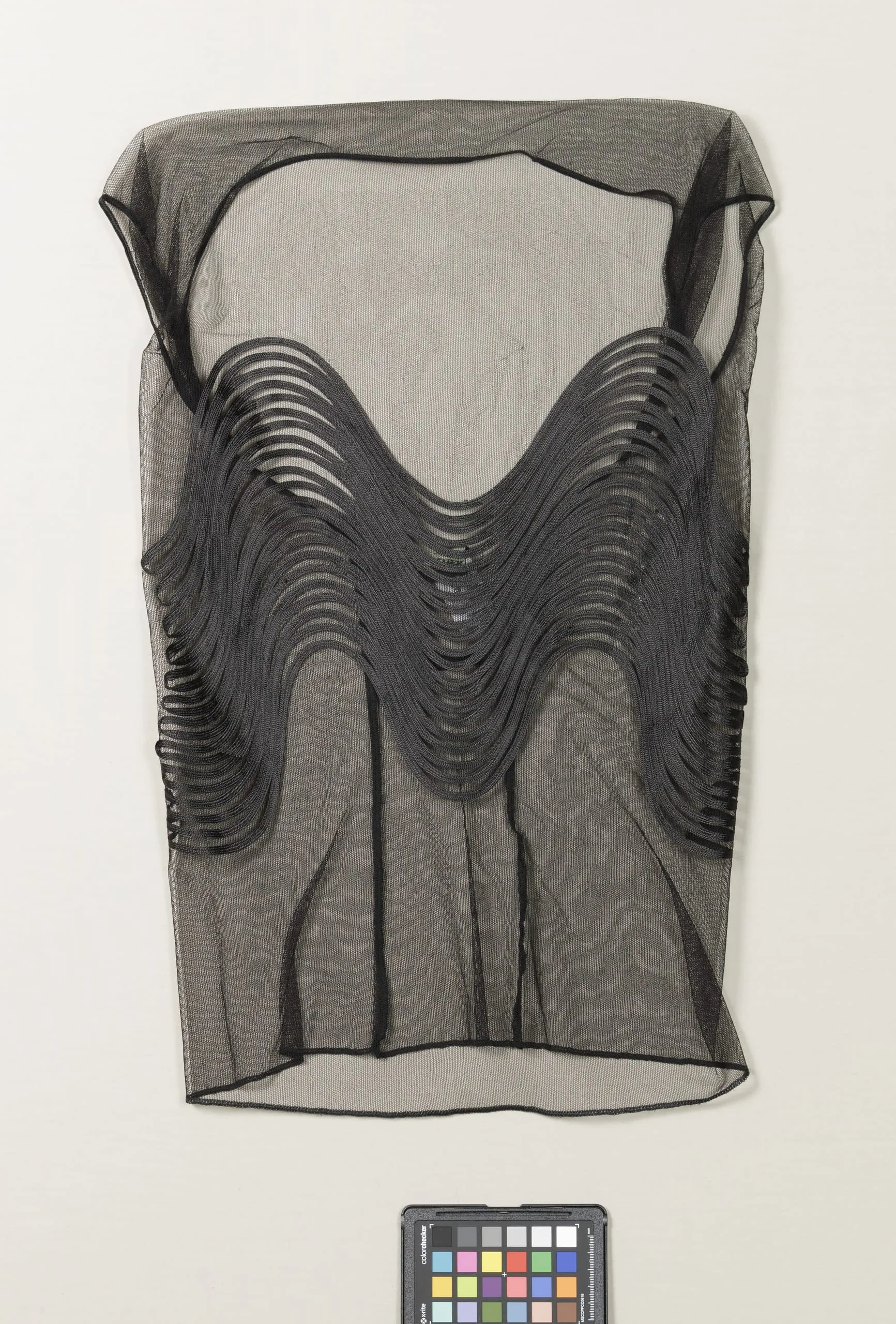 Black sheer mesh garment displayed flat against a white wall, with dozens of layered concentric fabric loops forming a symmetrical wing-shaped relief across the bodice