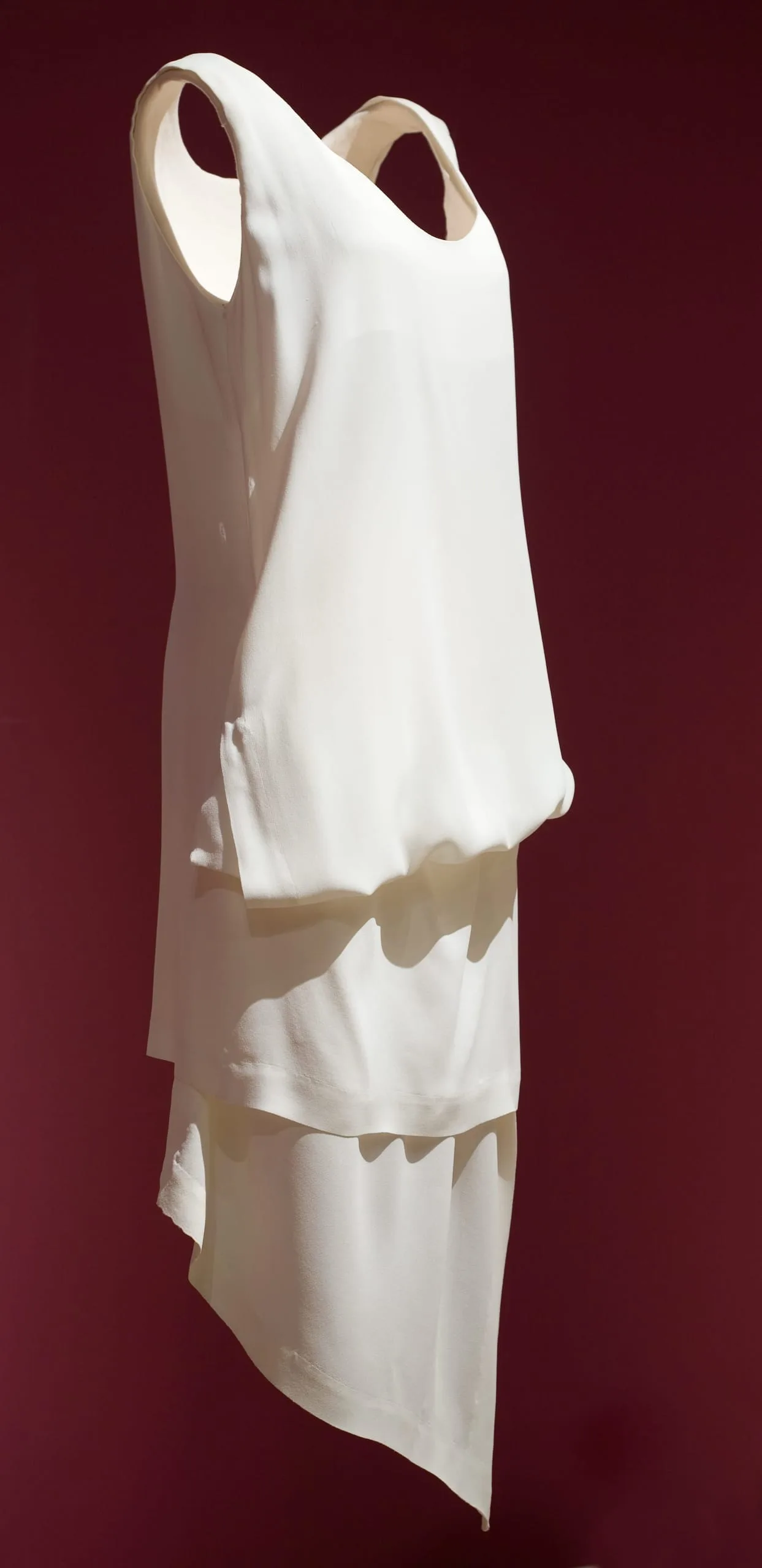 Cream-white sleeveless top and asymmetrical skirt ensemble displayed on an invisible mannequin against a deep crimson background