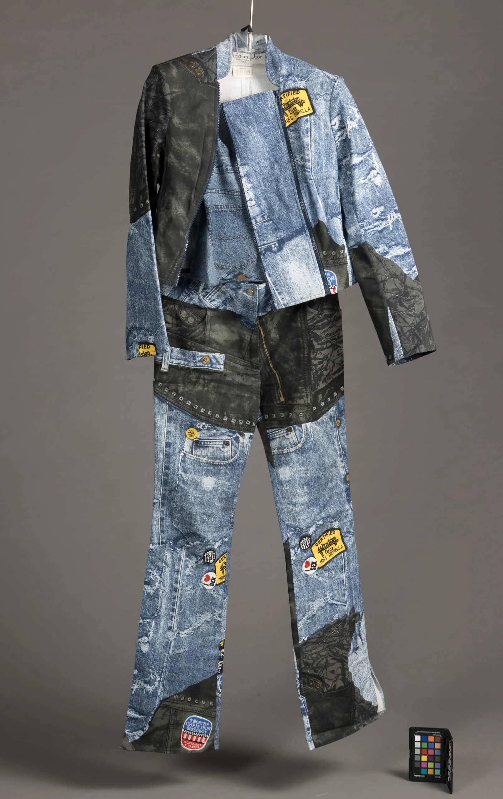 - Jacket and pants: Cotton/lycra twill, printed; Blouse: cashmere knit, printed; Belt: cotton/lycra twill, printed, metal