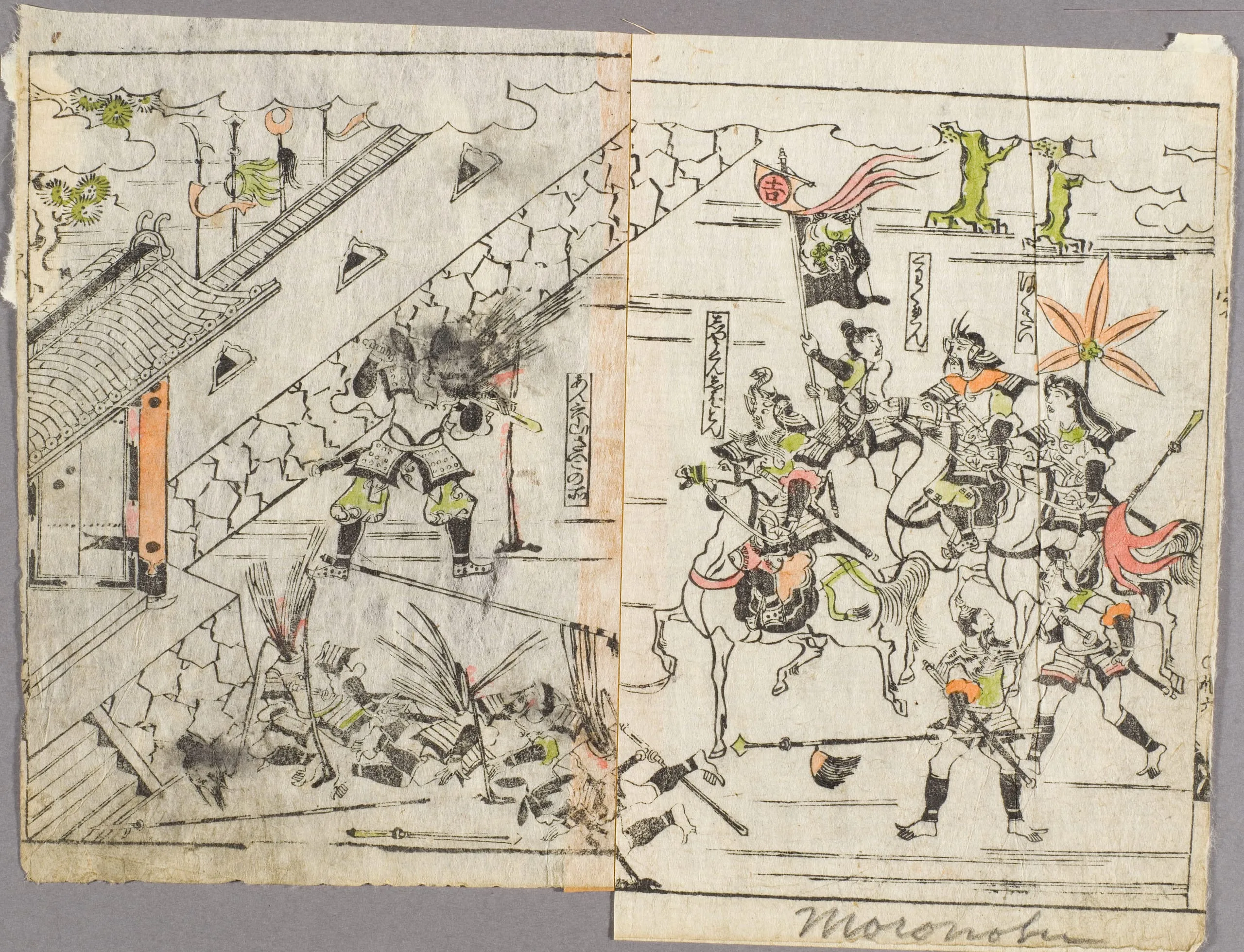 - Pair of hand-colored woodblock print pages from a book (tanrokubon)