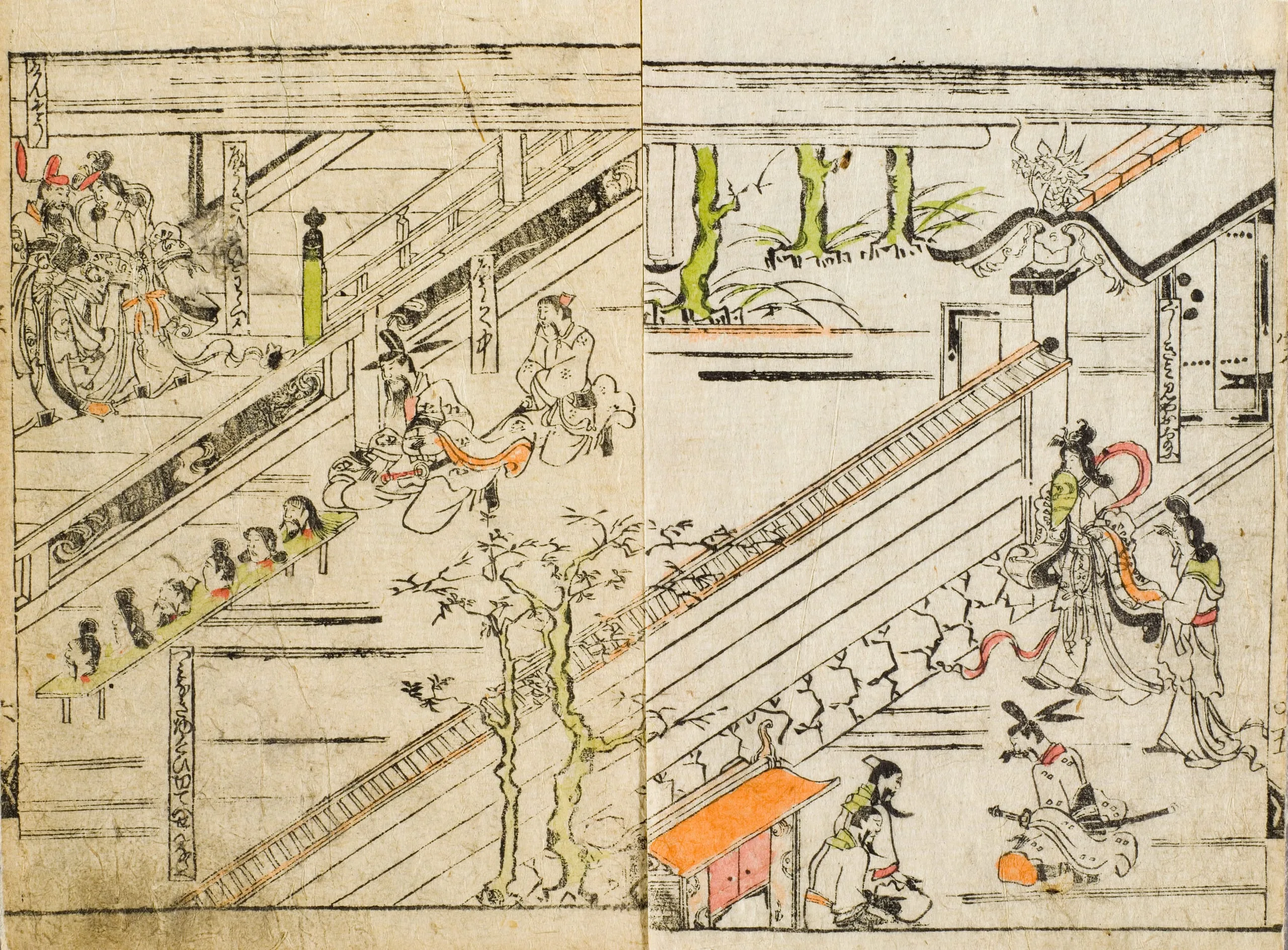 - Pair of hand-colored woodblock print pages from a book