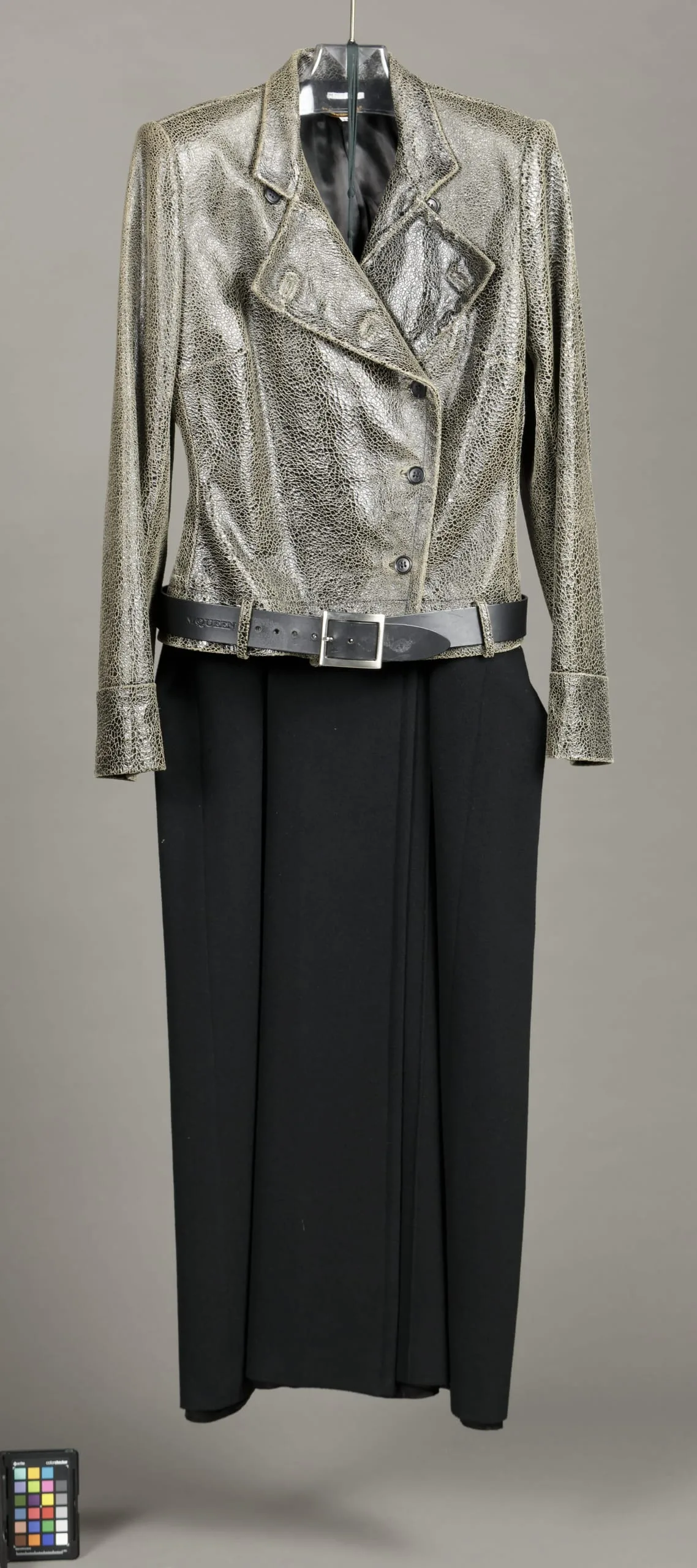 - Jacket: Leather; Skirt: Wool cashmere, brushed; Belt: Leather and metal
