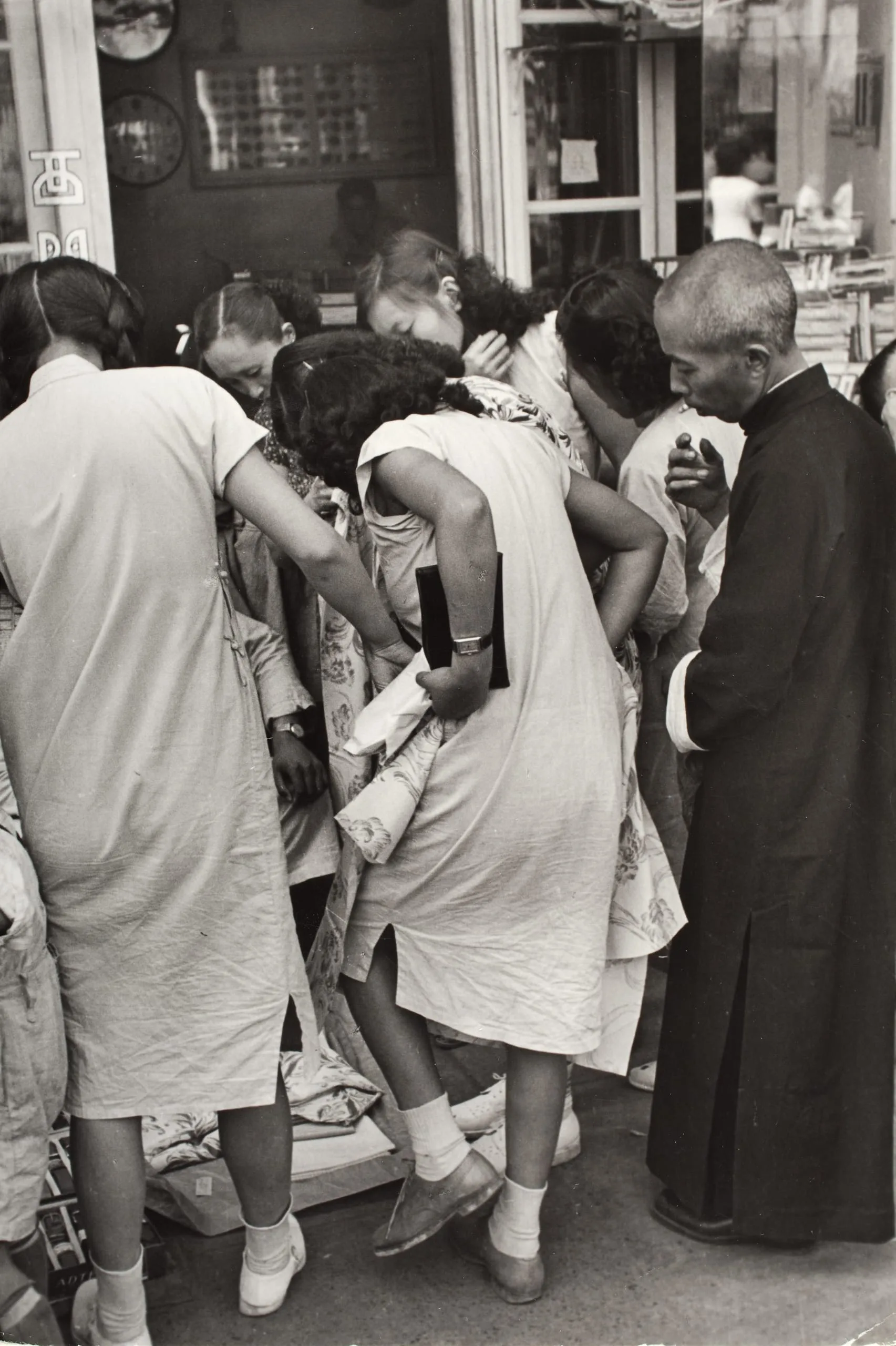 Black and white photograph of a crowd of people on a sidewalk, all leaning forward to look at something below frame, with a robed man standing to the right