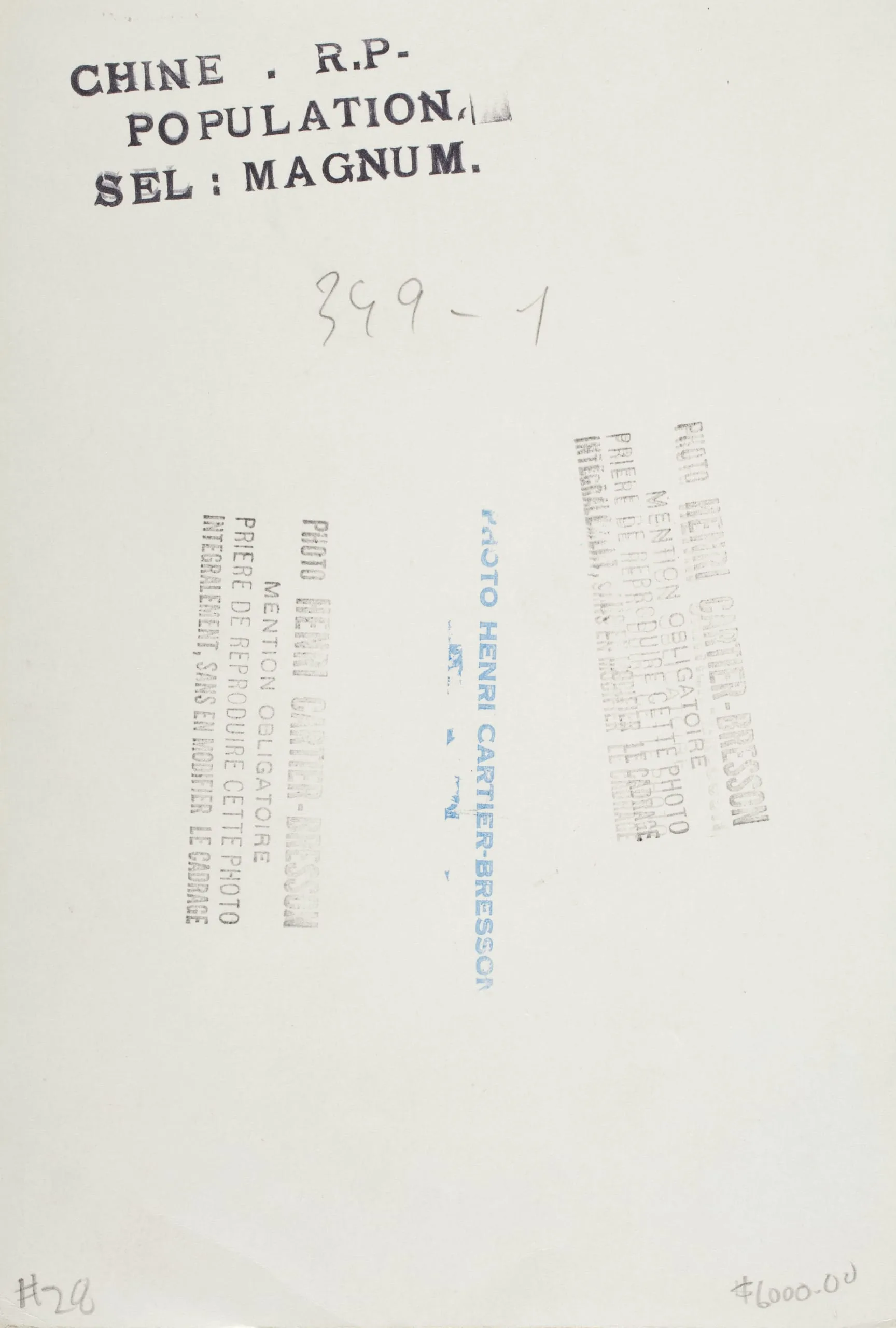Verso of a photograph print showing typed and rubber-stamped text in black and blue ink on white paper, including handwritten notations in pencil at top and bottom corners.