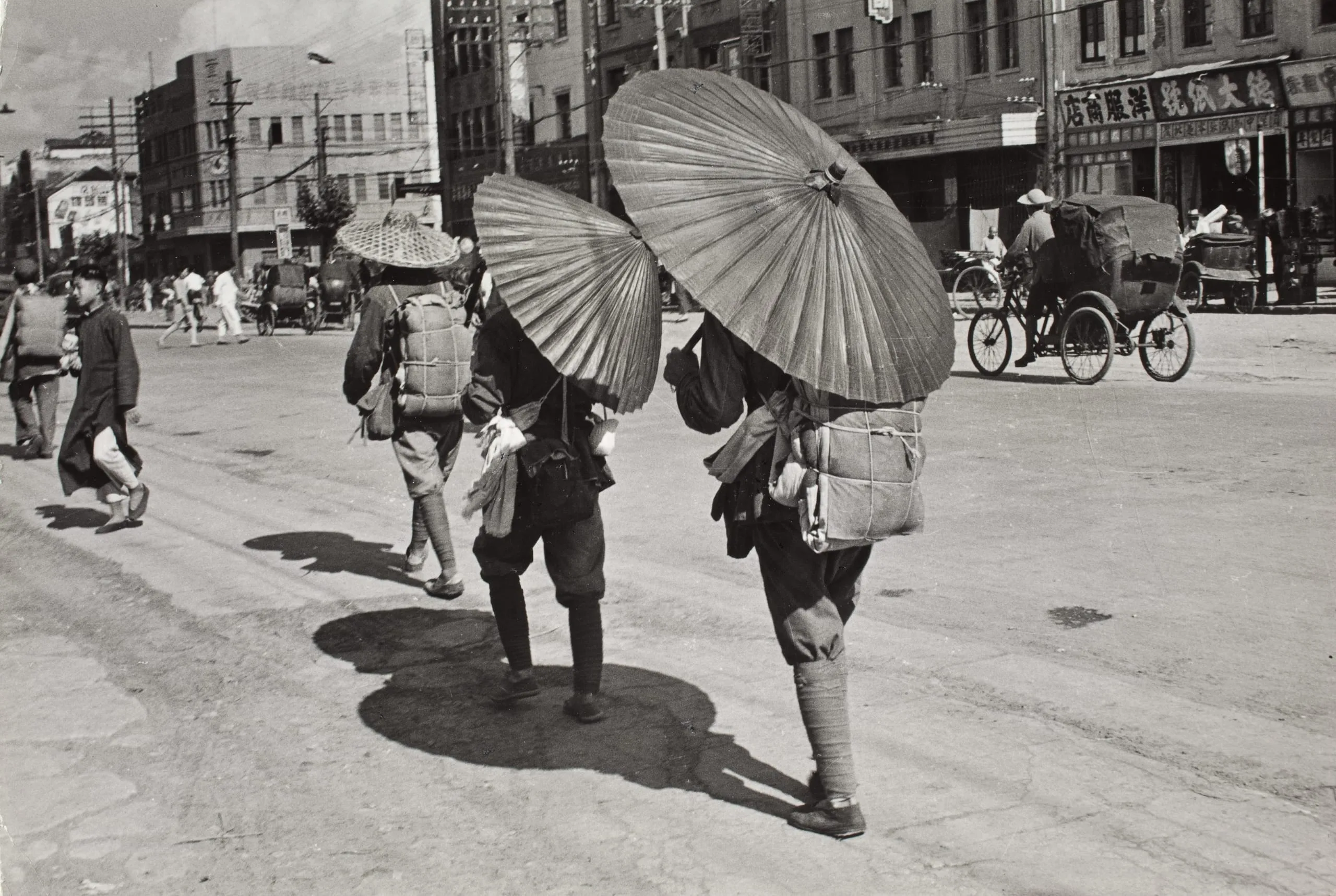 - China (Nanking. Three soldiers; the one in front has a straw hat, those following carry paper umbrellas; like all PLA soldiers they wear sandals, and carry an extra pair strapped to their backs)