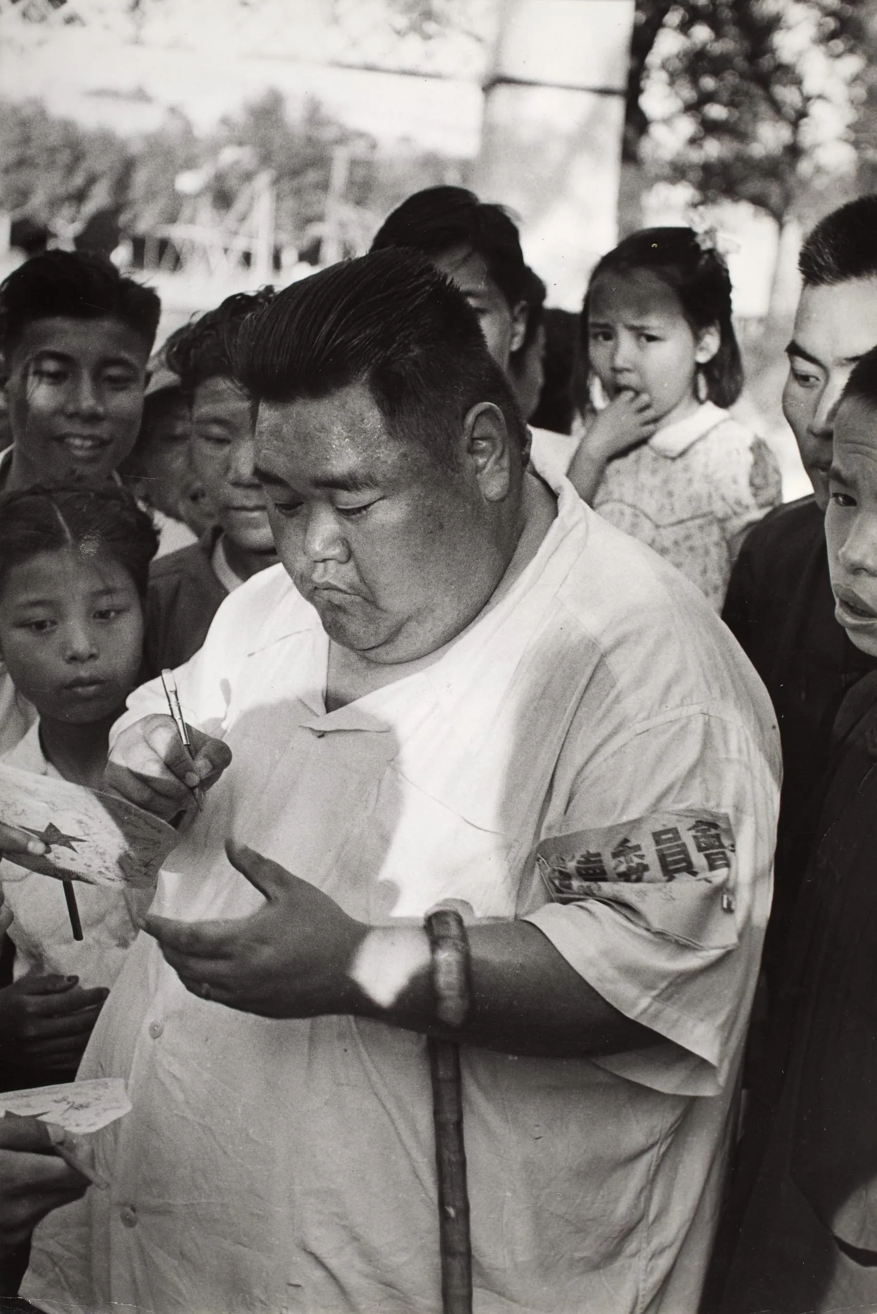Black and white photograph of a heavyset man with a tattooed arm holding a small star-shaped object and applying something with a thin stick, surrounded by a crowd of children and adults outdoors
