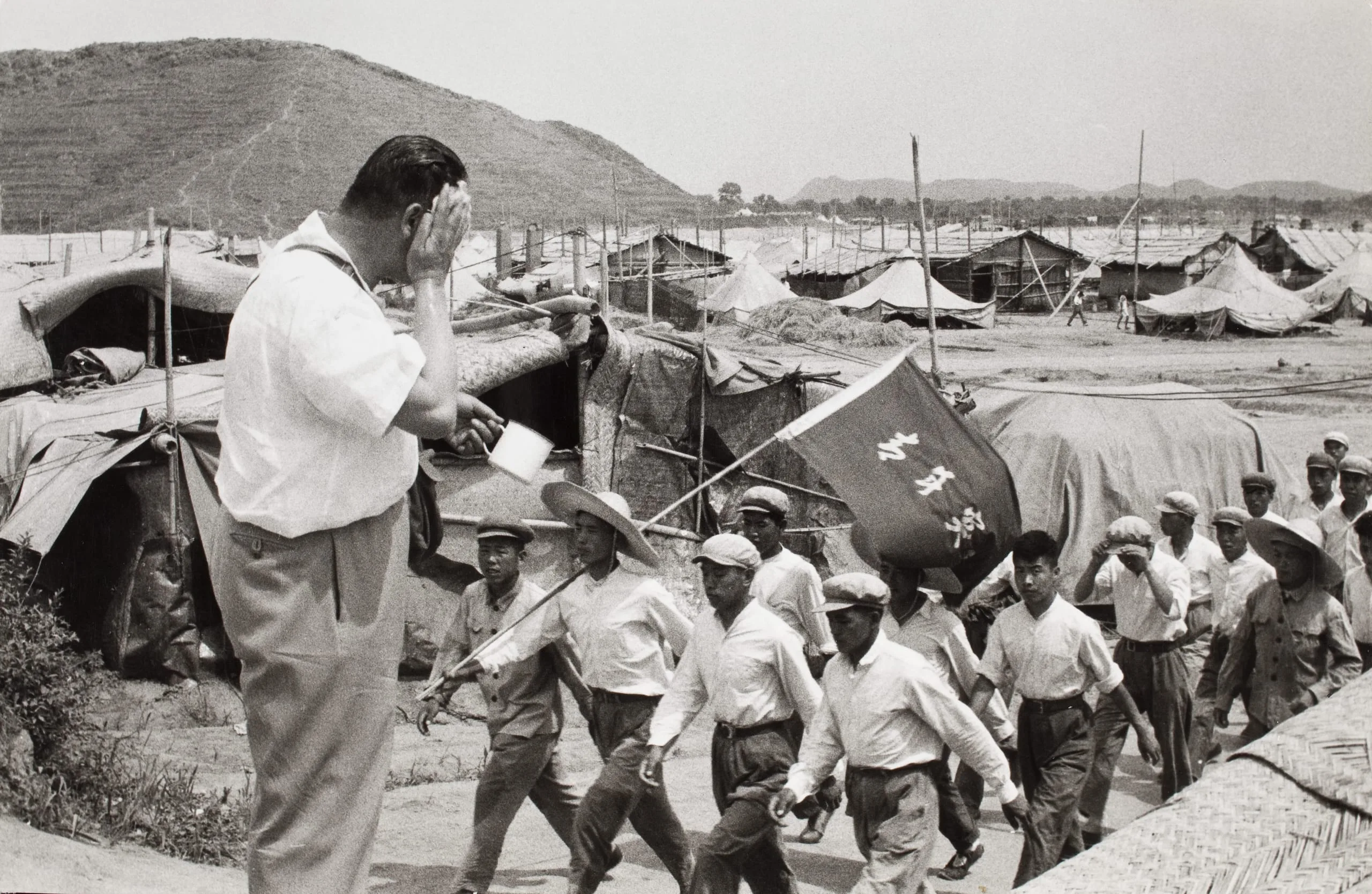 Black and white photograph of a man with his hand over his face watching a column of men march past a sprawling tent camp, one carrying a banner with Chinese characters