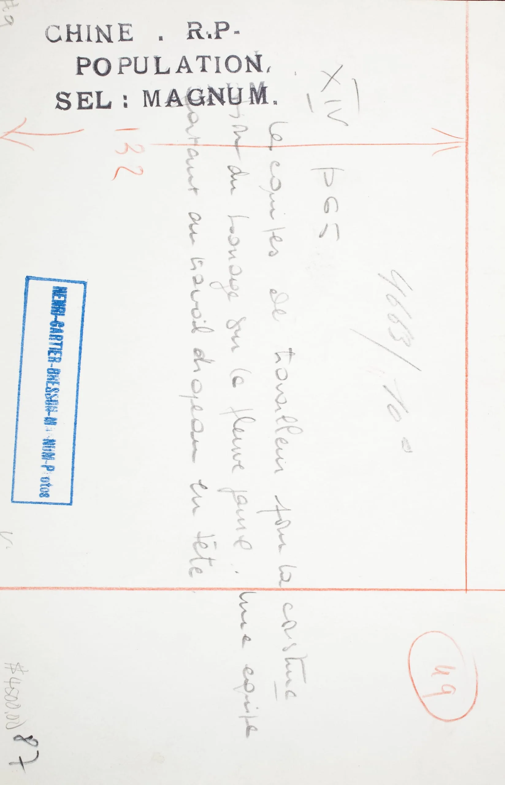 Verso of a photograph with typed text reading 'CHINE . R.P.- POPULATION, SEL : MAGNUM.' at top, handwritten French annotations in pencil, red crop-mark lines, and a blue rectangular archive stamp at left.