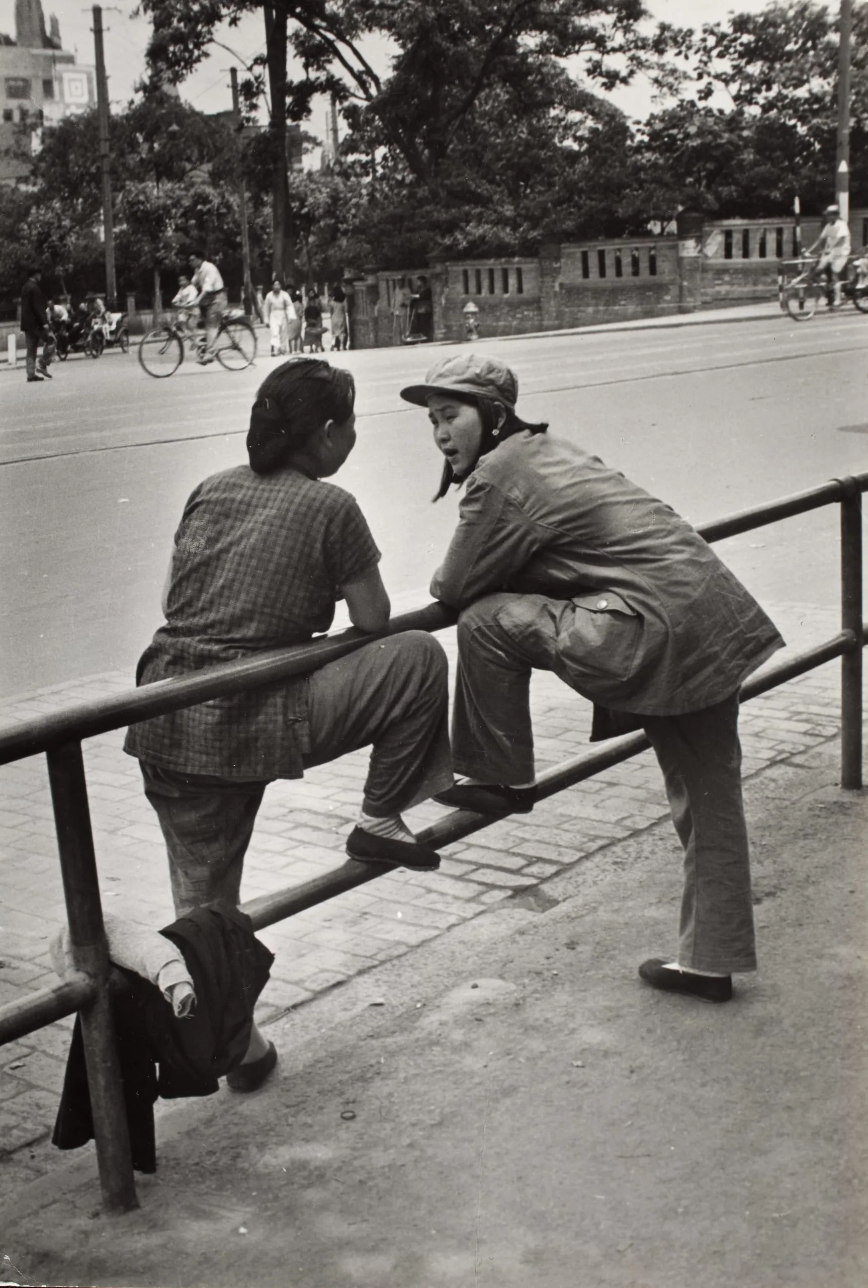 Black and white photograph of two people at a city railing, one seated with back to camera, the other standing and leaning in close, speaking, with a busy street and cyclists behind them