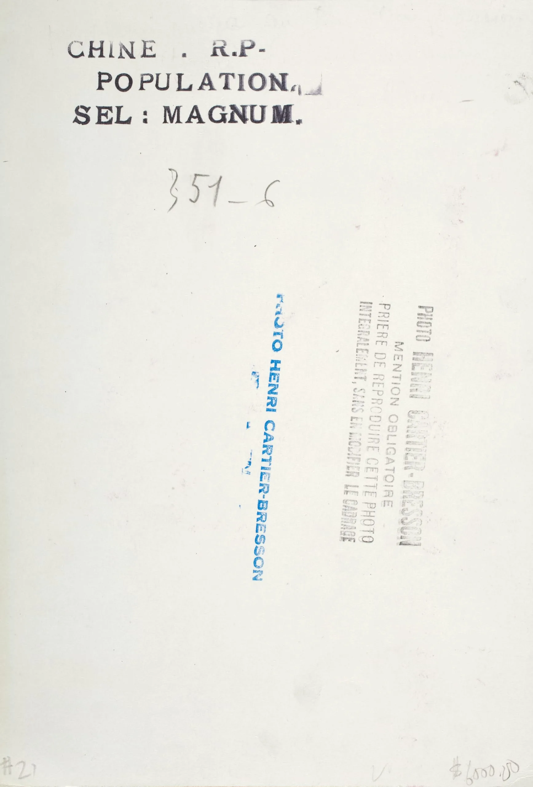 Verso of a photograph print with typed label reading 'CHINE . R.P- POPULATION. SEL : MAGNUM.' and handwritten notation '351-6,' along with two rubber stamps in blue and black ink.