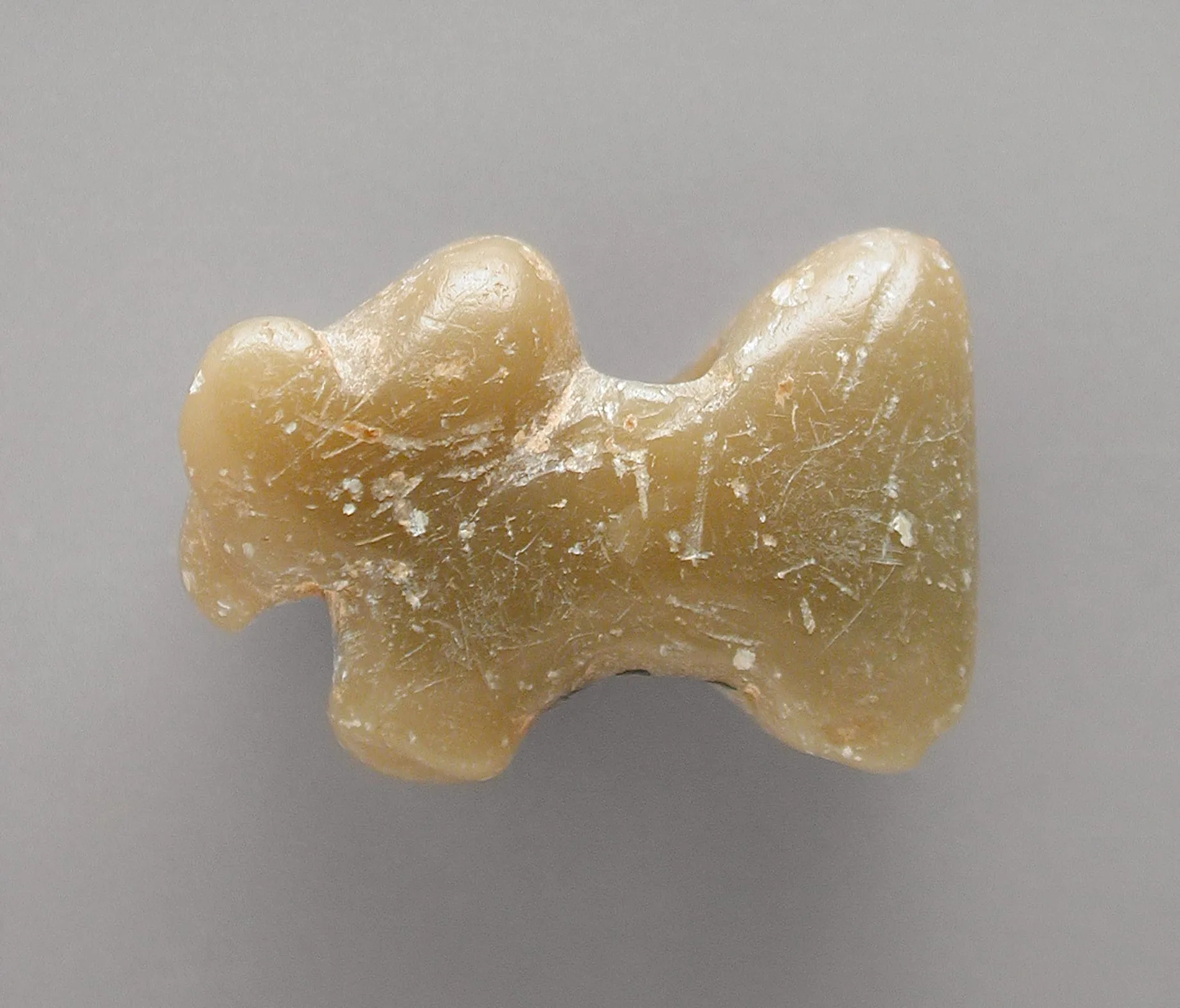 Small carved stone sculpture in pale amber-yellow, possibly alabaster, with a pinched waist and rounded lobed forms, viewed from slightly above