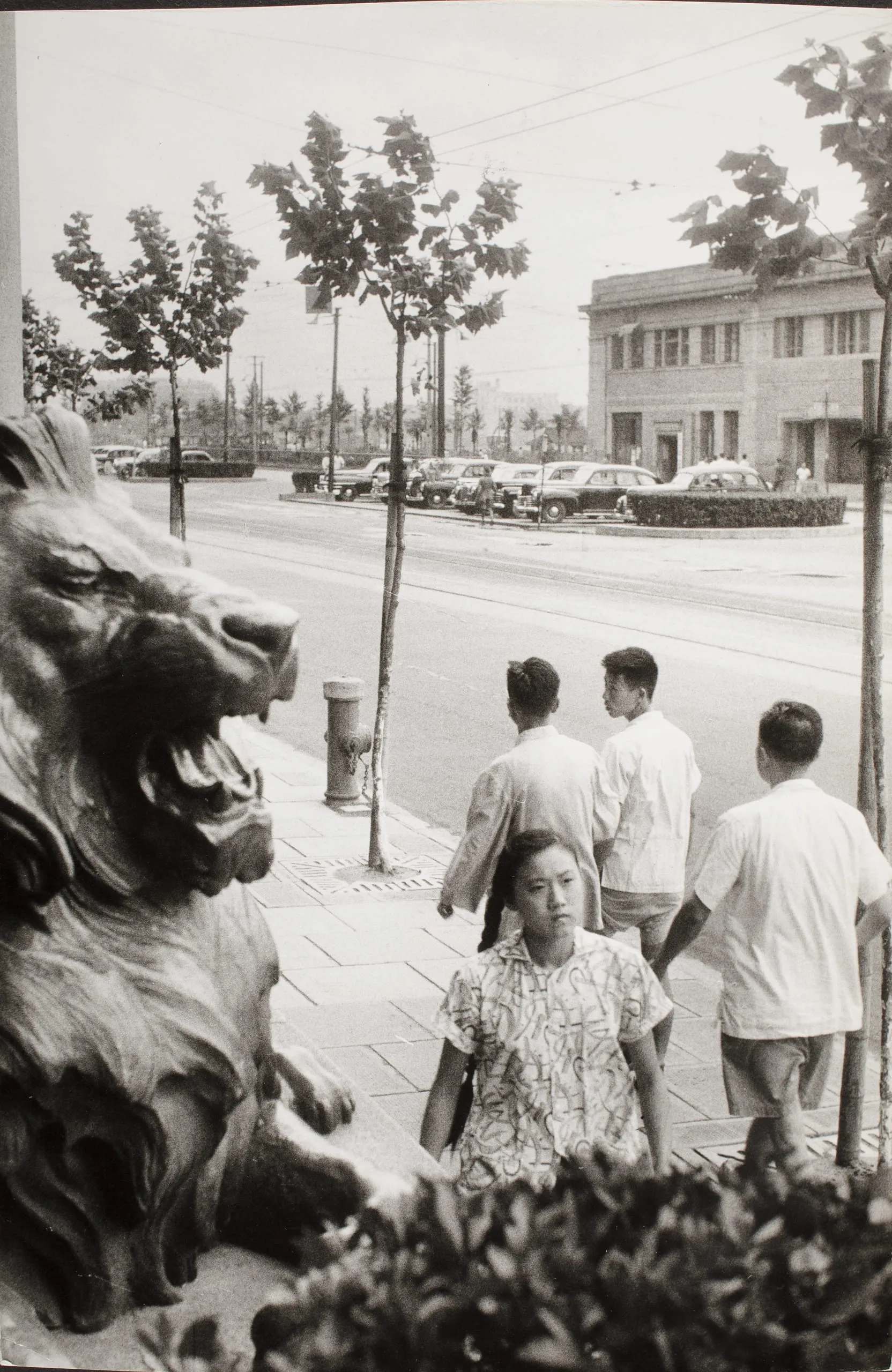 Black and white photograph of a girl standing beside a large stone lion sculpture on a city sidewalk, with pedestrians and parked mid-century cars in the distance