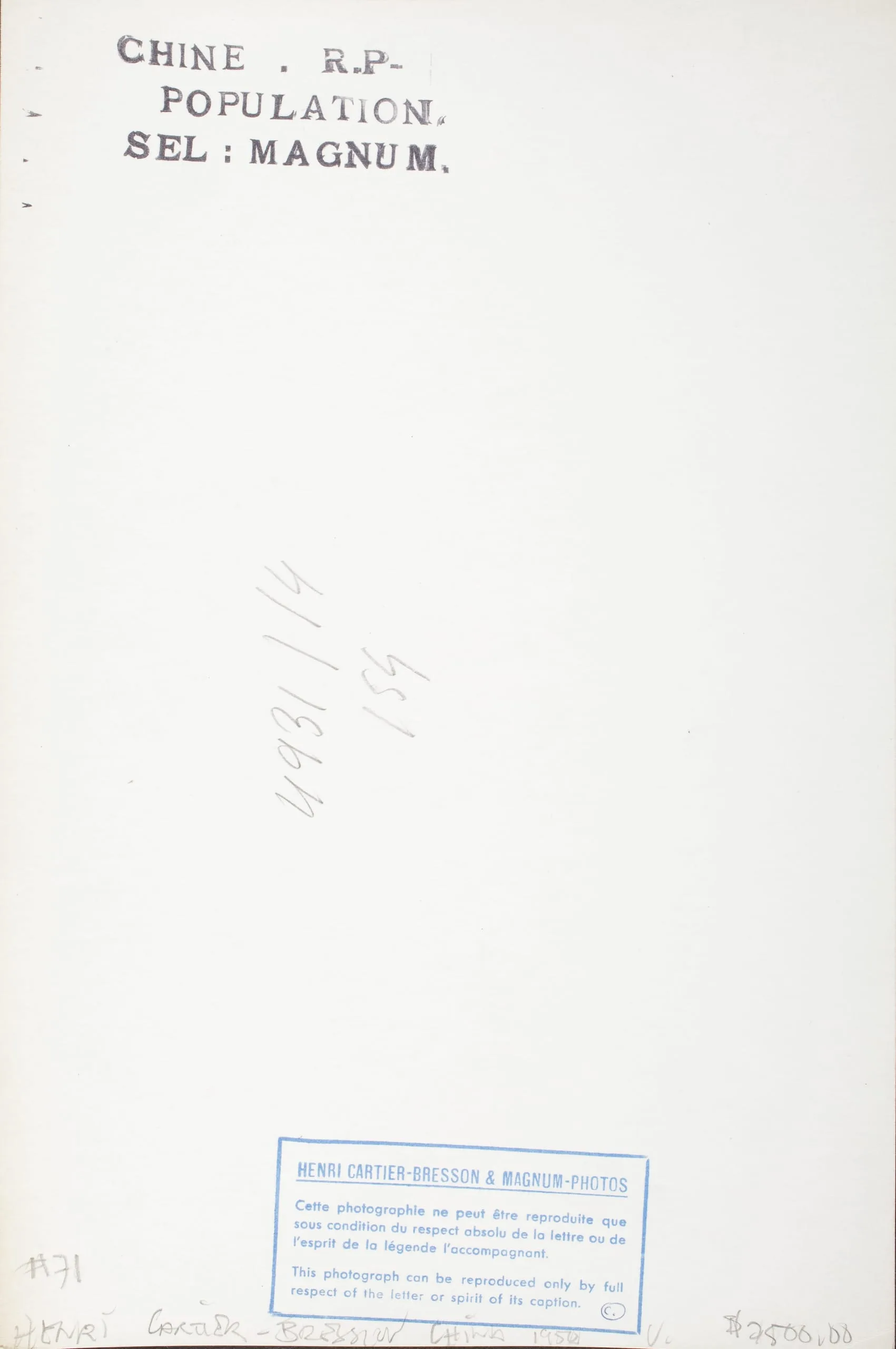 Verso of a gelatin silver print with typed caption, handwritten numbers, and a Henri Cartier-Bresson & Magnum Photos copyright stamp in blue ink at lower center.