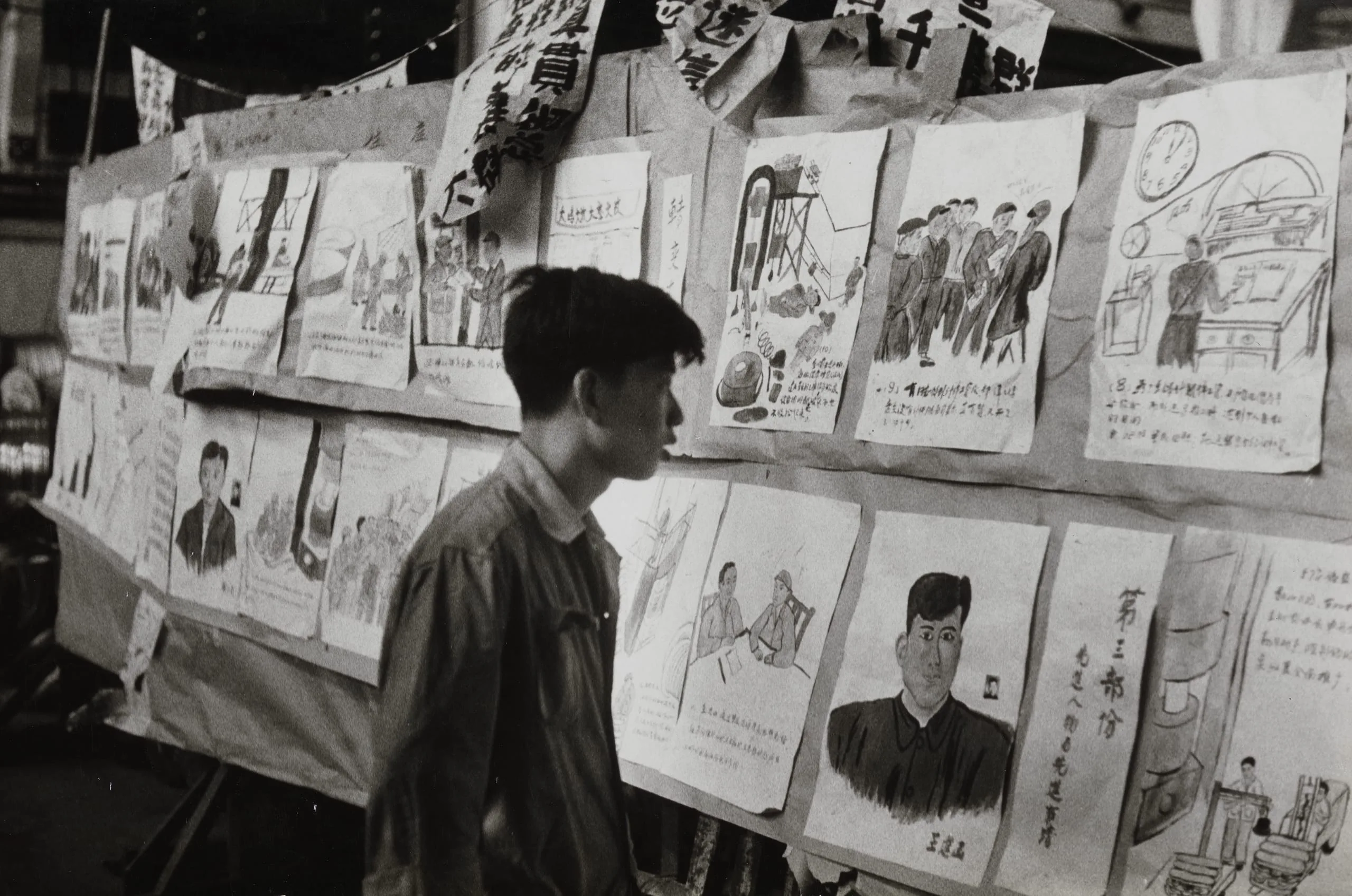 Black and white photograph of a young man in left profile reading a wall covered in hand-drawn posters and Chinese-script text
