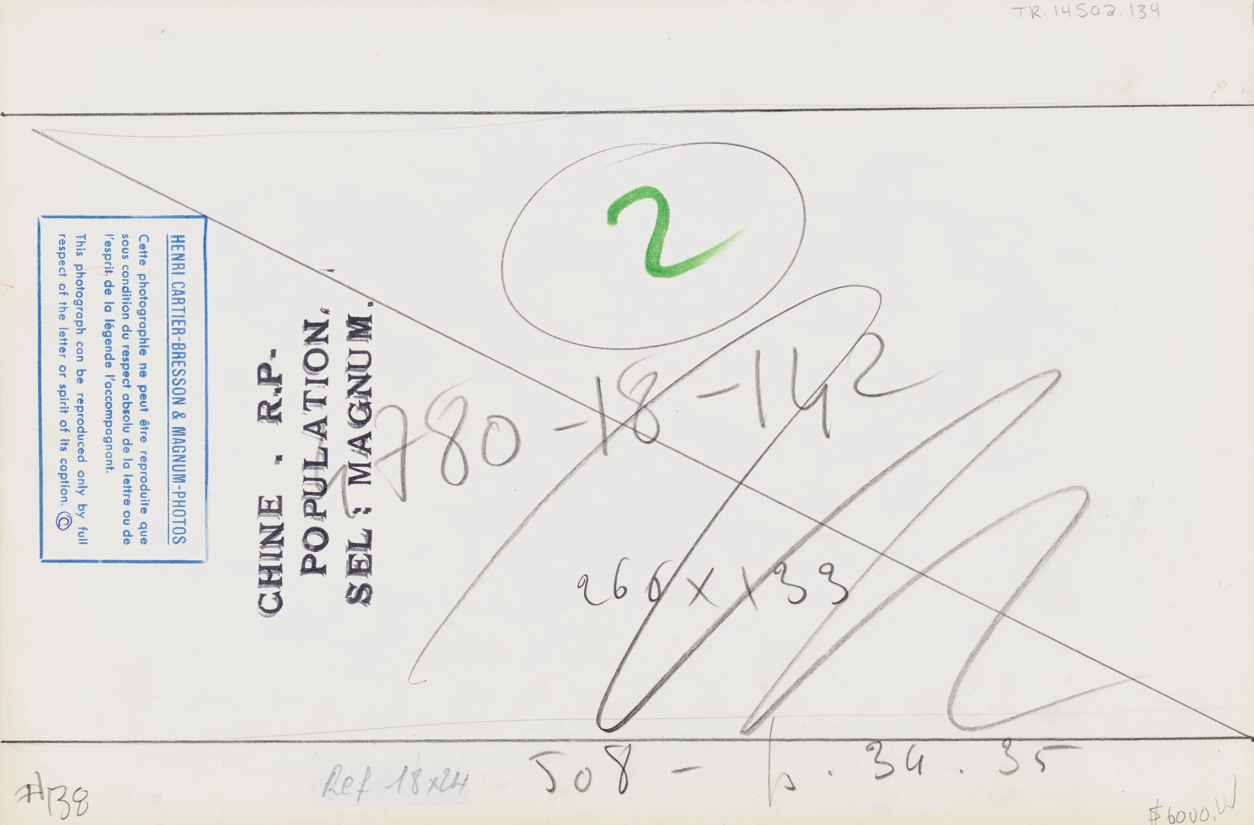 Verso of a photograph print with a blue copyright stamp, typed text reading 'CHINE · R.P. / POPULATION. / SEL : MAGNUM,' handwritten pencil annotations including numbers and dimensions, and a circled green numeral 2.