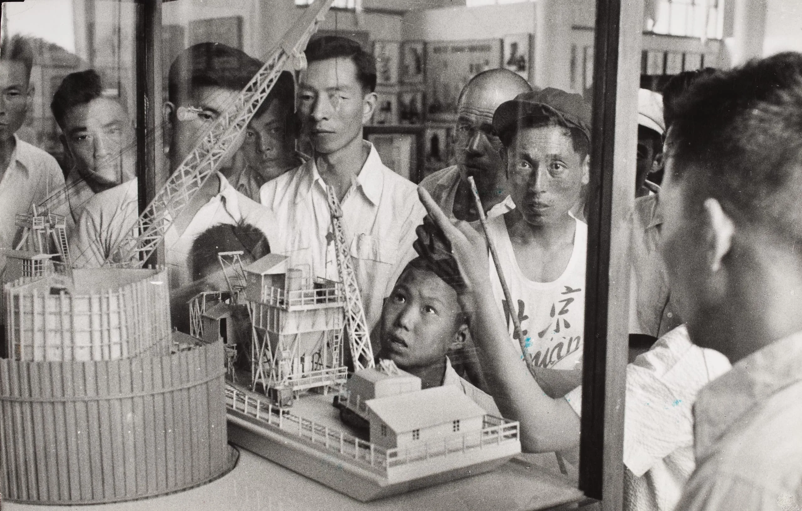 Black and white photograph of a group of people peering through a glass display case at a detailed industrial scale model with a crane and cylindrical structures