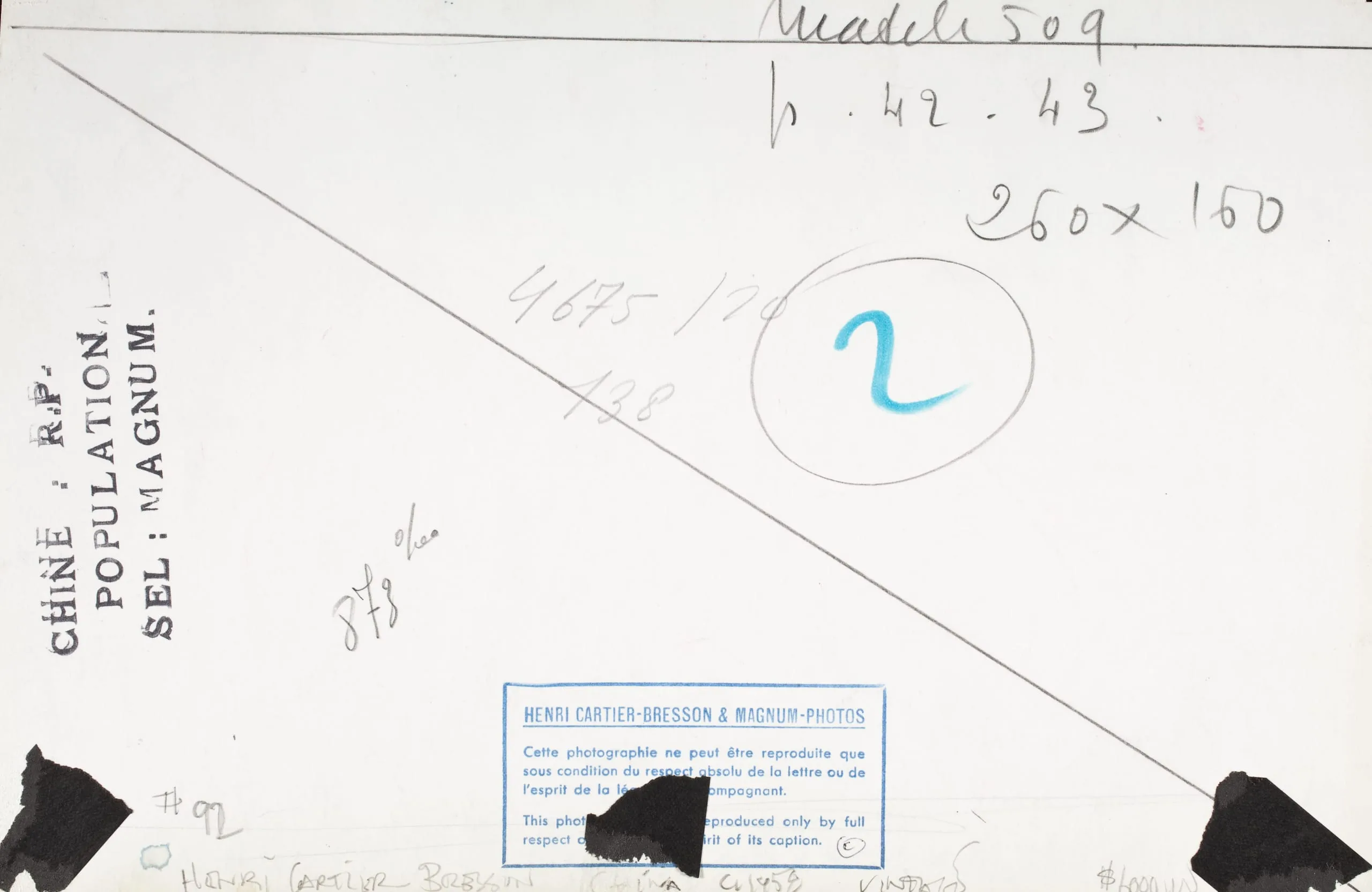 Verso of a photograph print with handwritten annotations, a diagonal pencil line, a blue circled number 2, rubber-stamped text reading 'CHINE : R.P. POPULATION. SEL : MAGNUM.' at left, and a printed Henri Cartier-Bresson & Magnum-Photos label at bottom center.