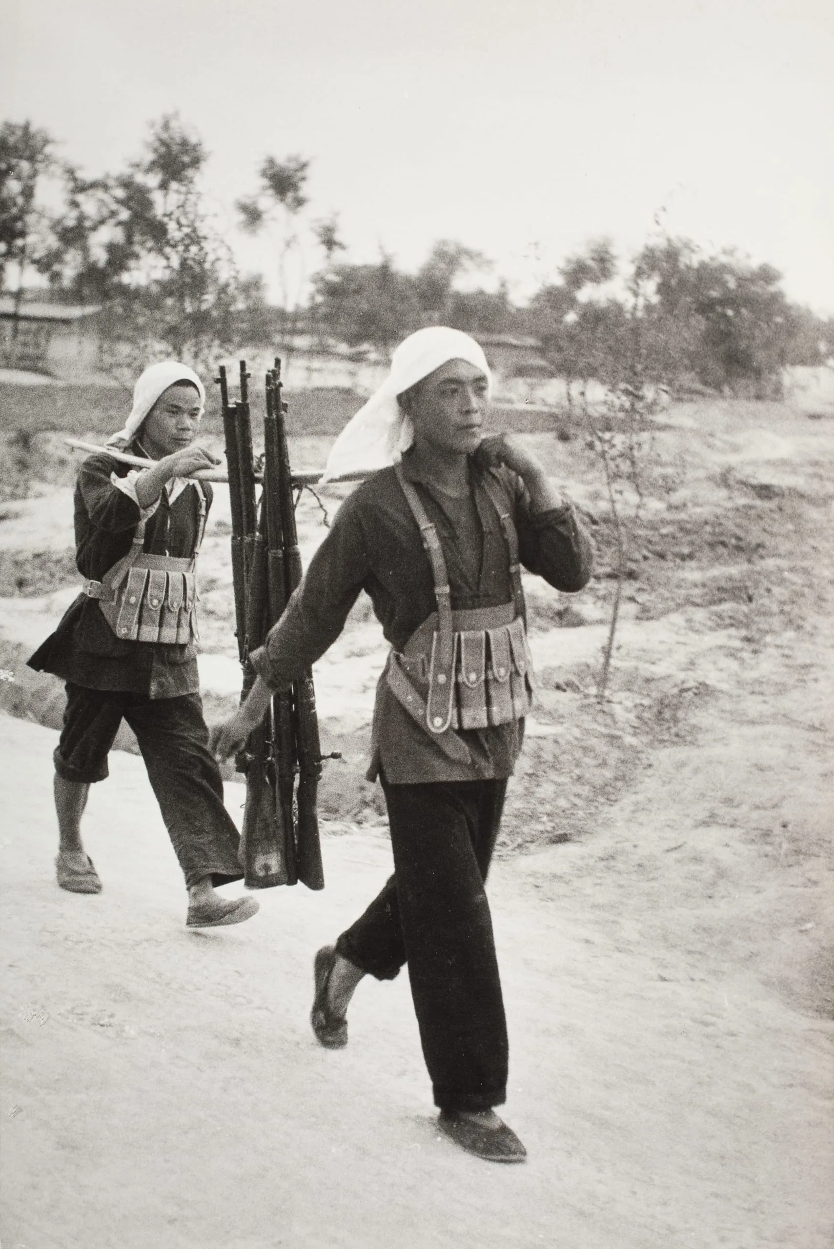 Black and white photograph of two armed men walking along a dirt path, each wearing white head cloths and ammunition chest rigs and carrying rifles