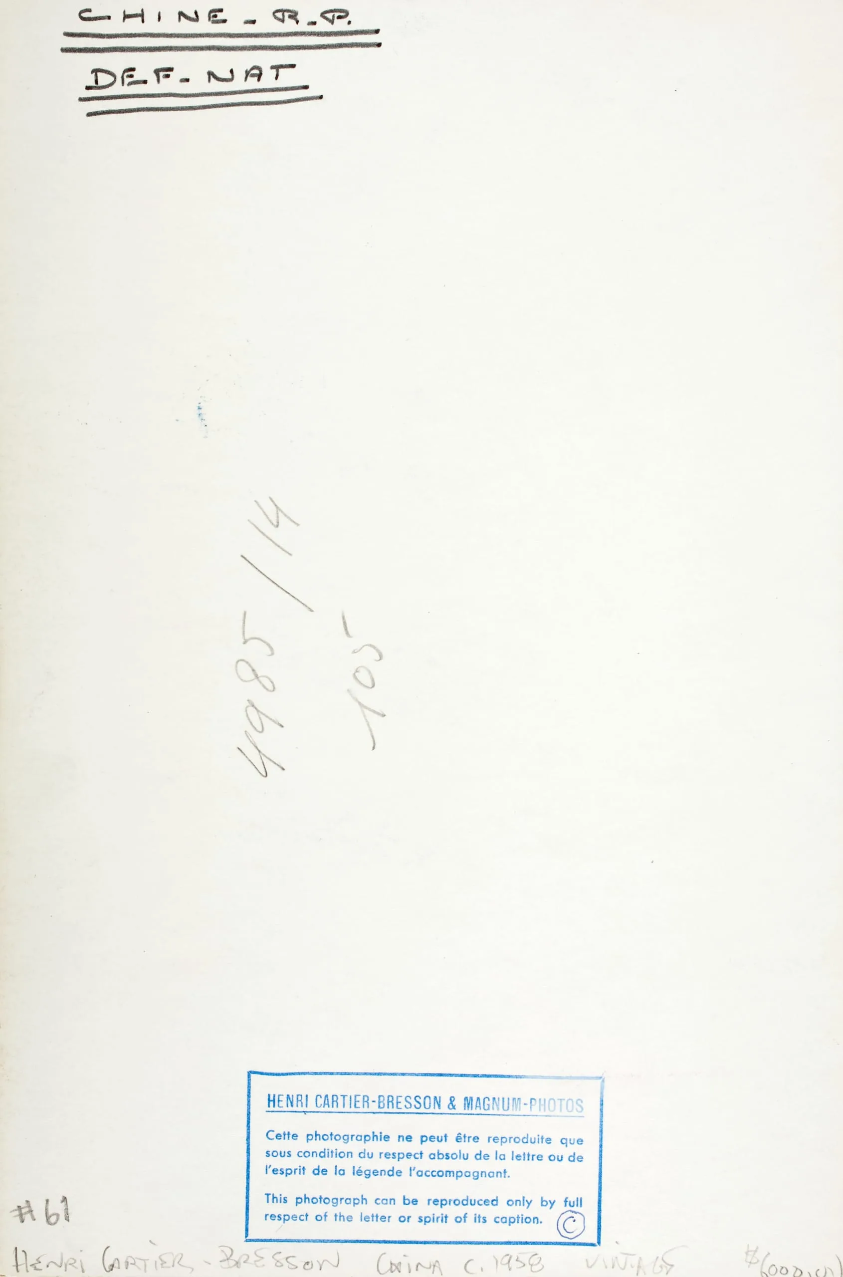 Verso of a photograph print; handwritten annotations including '49985/14' and '103–', a Henri Cartier-Bresson & Magnum Photos reproduction rights stamp in French and English, and penciled notes along the bottom edge.