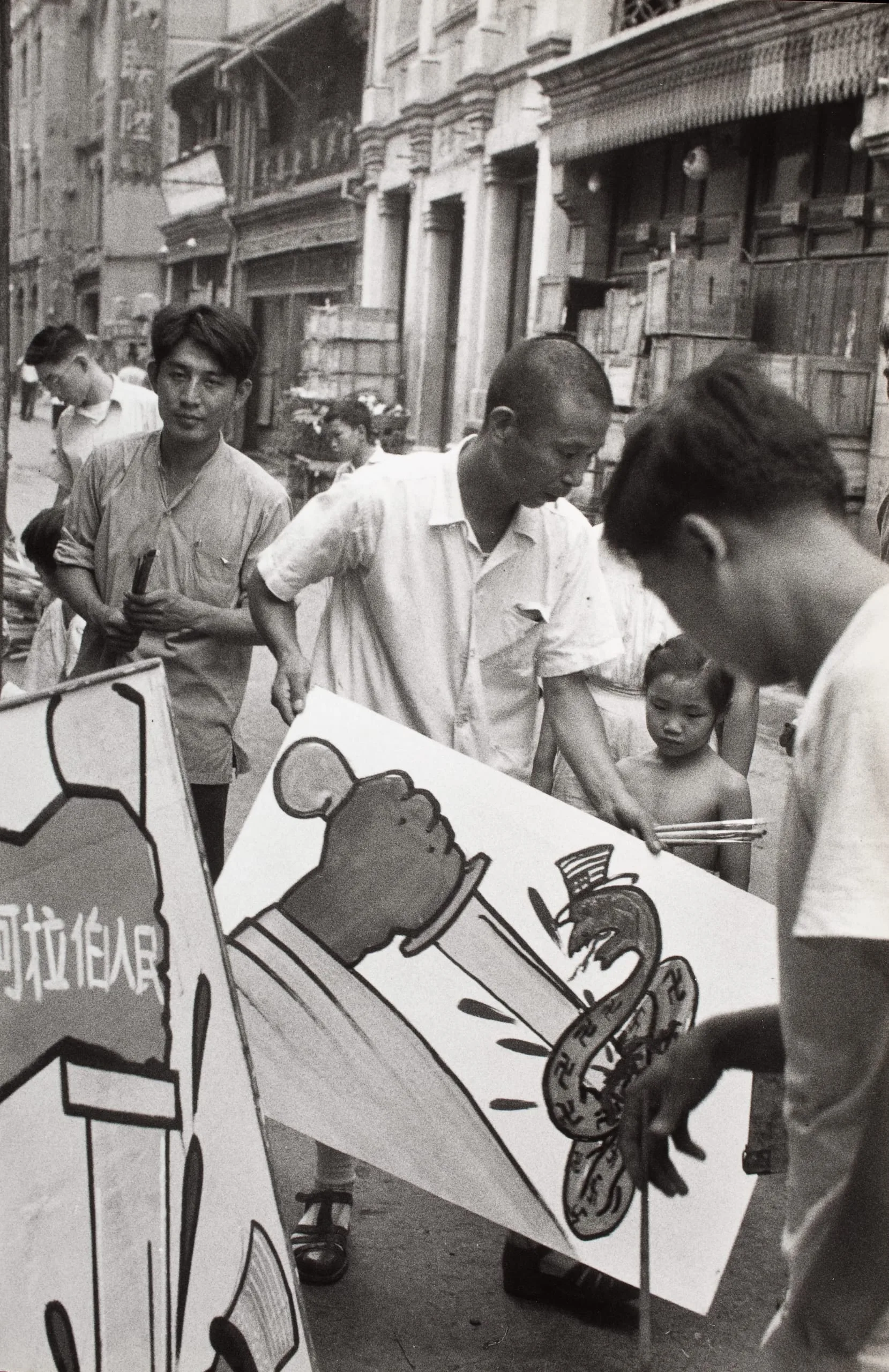 Black and white photograph of young men on a Chinese city street handling large illustrated propaganda placards with bold graphic imagery and Chinese text