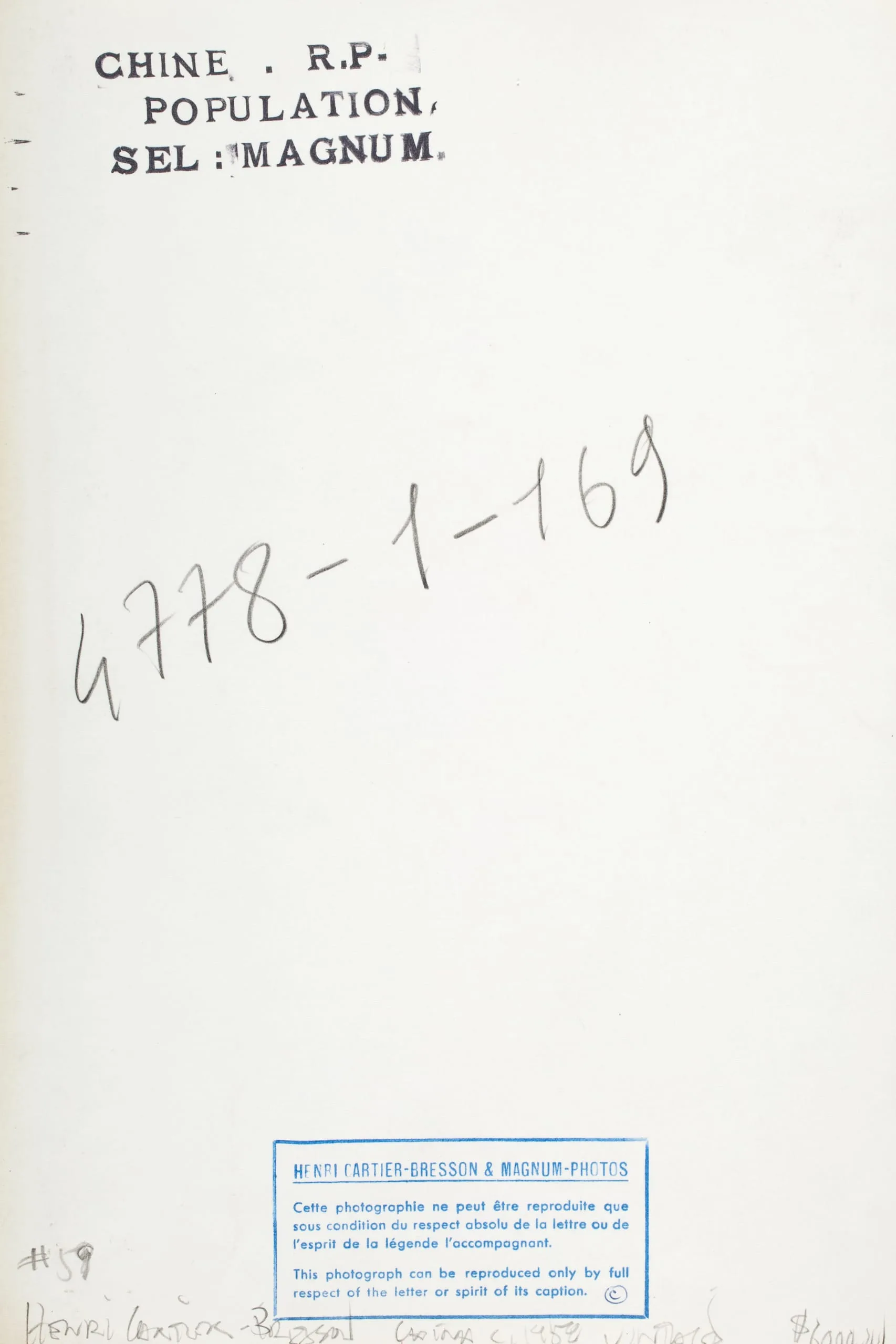 Verso of a photograph print with typed label reading "CHINE . R.P. POPULATION, SEL : MAGNUM," handwritten number "4778-1-169," and a printed Henri Cartier-Bresson & Magnum Photos reproduction rights stamp at bottom.
