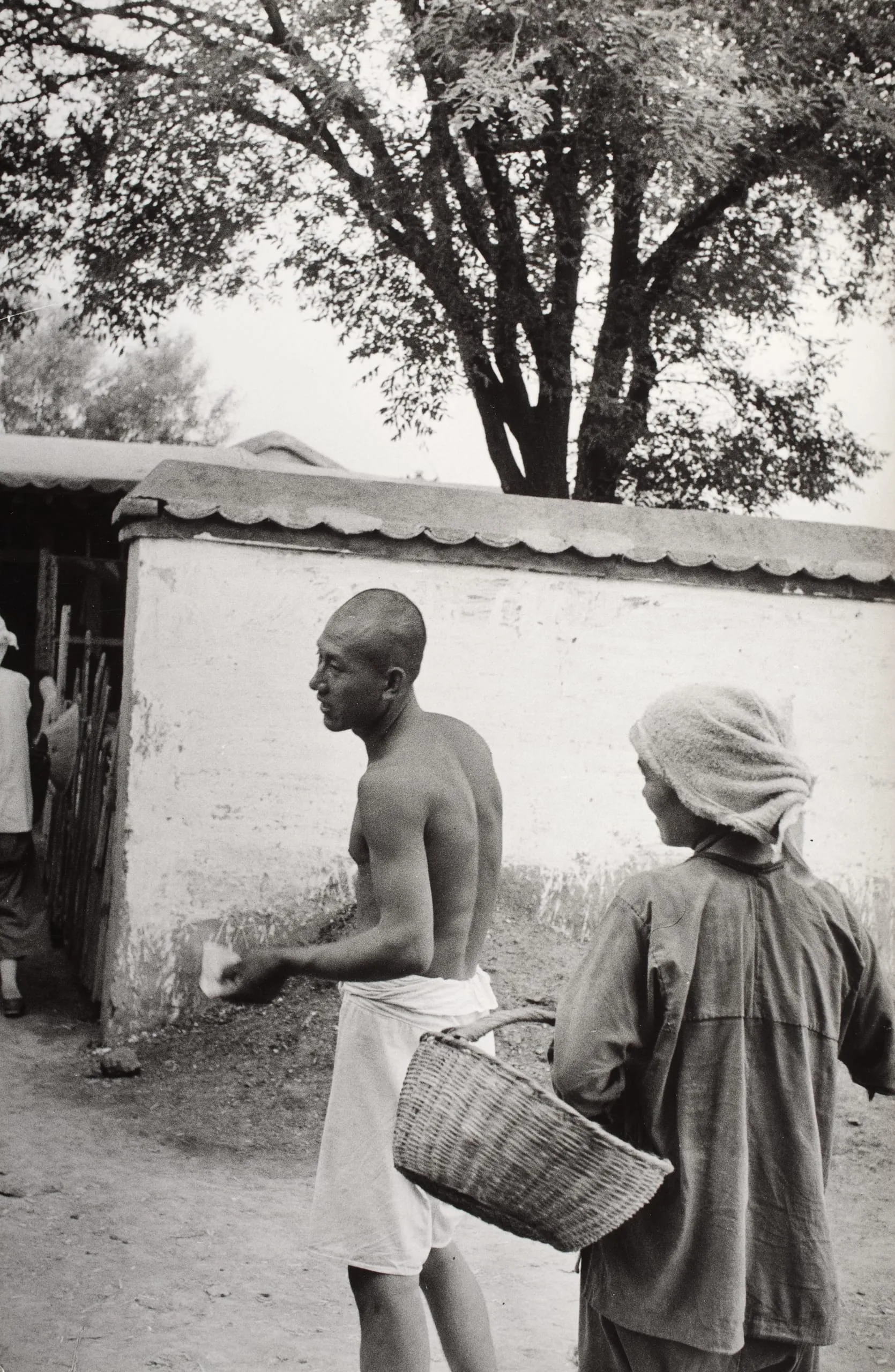 Black and white photograph of two figures outdoors beside a whitewashed building, a shirtless man in profile and a person with a wrapped head carrying a woven basket