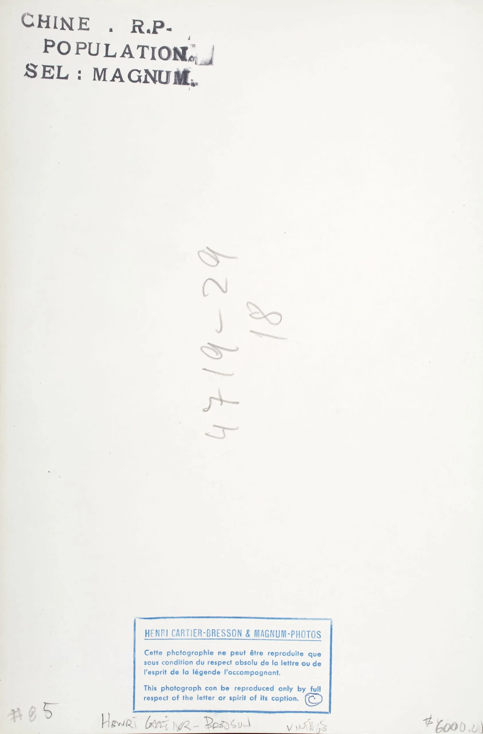 Verso of a gelatin silver print showing stamped annotations in French, a handwritten number in pencil, and a printed Magnum Photos copyright label at bottom.
