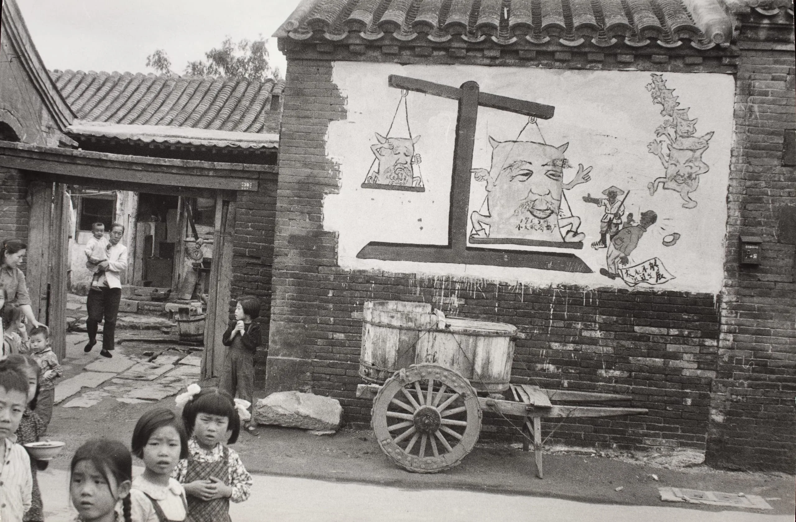 Black and white photograph of a Chinese village street with children in the foreground and a large propaganda-style mural painted on a whitewashed brick wall, depicting caricatured figures on a balance scale with Chinese characters