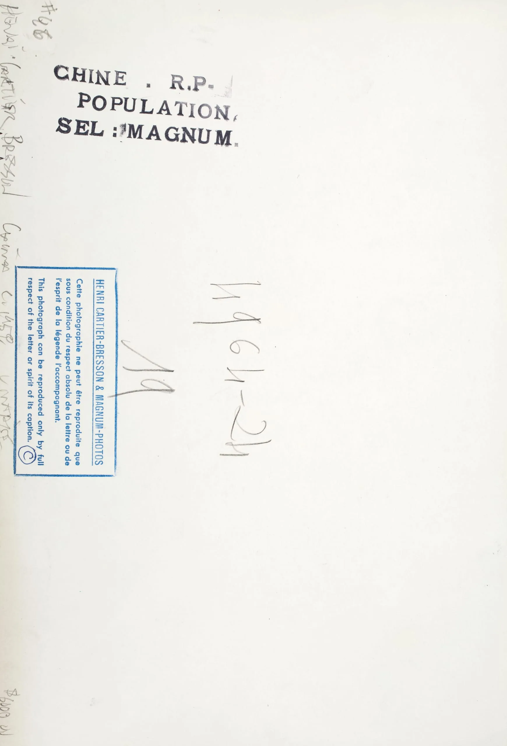 Verso of a photograph print showing typed caption stamps, handwritten annotations, and a blue Magnum Photos copyright label with French and English text.
