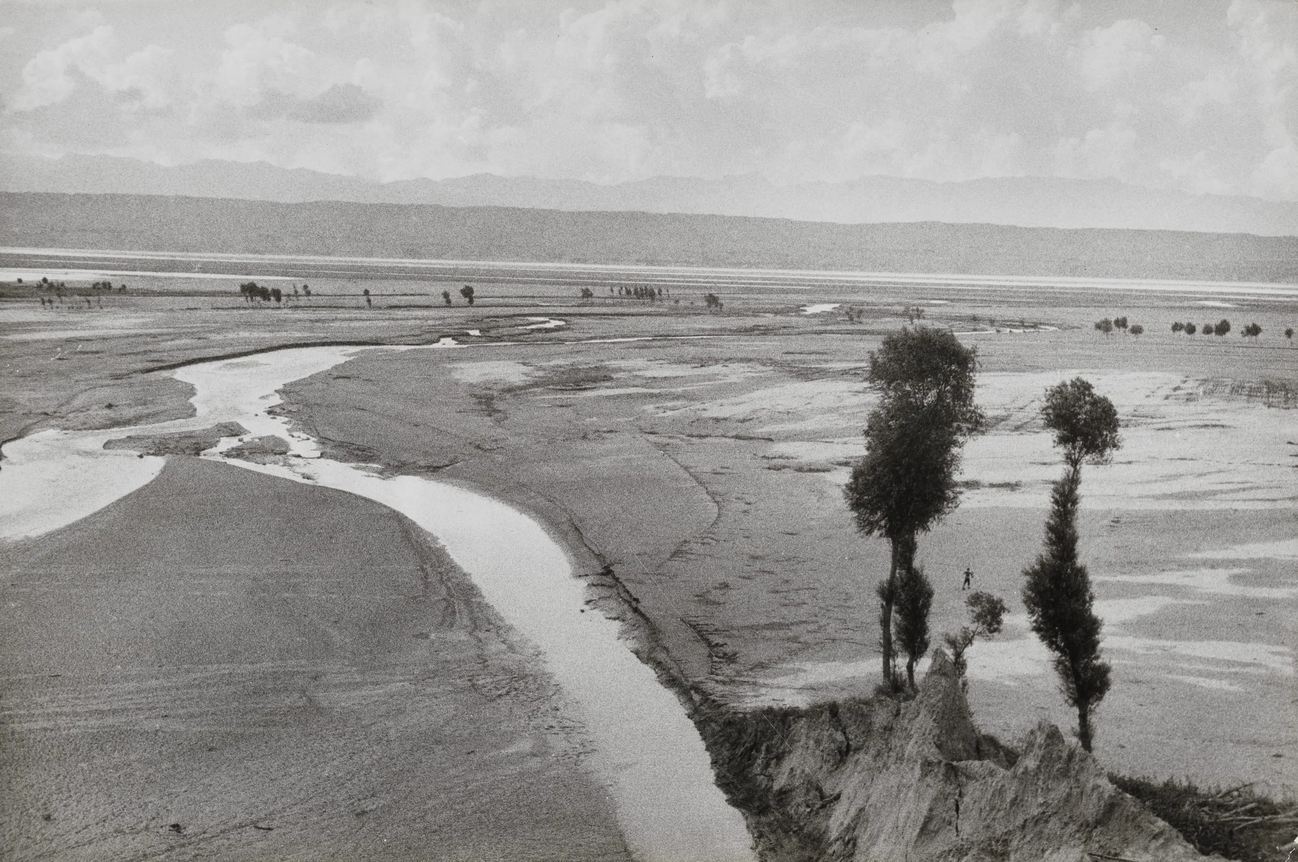 Black and white photograph of a wide, shallow river delta with braided waterways, a cluster of tall slender trees on an eroded bank, and tiny figures crossing a flat plain, mountains in the distance