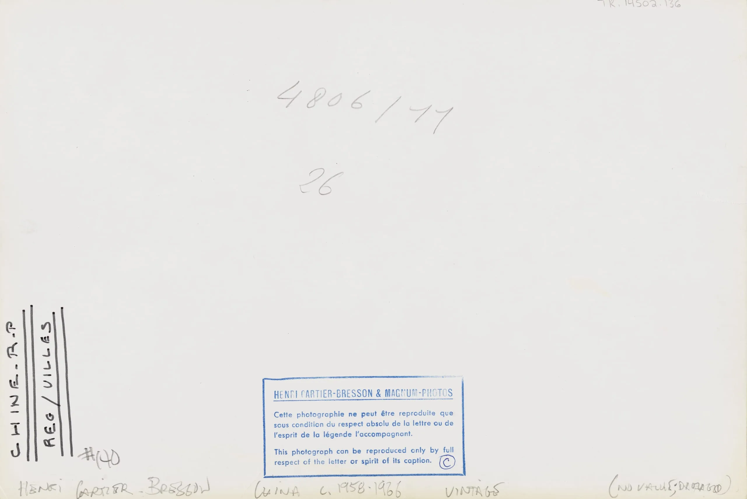Verso of a gelatin silver print showing penciled numbers, handwritten annotations, a printed Henri Cartier-Bresson & Magnum Photos copyright stamp in blue ink, and categorical labels along the left edge.