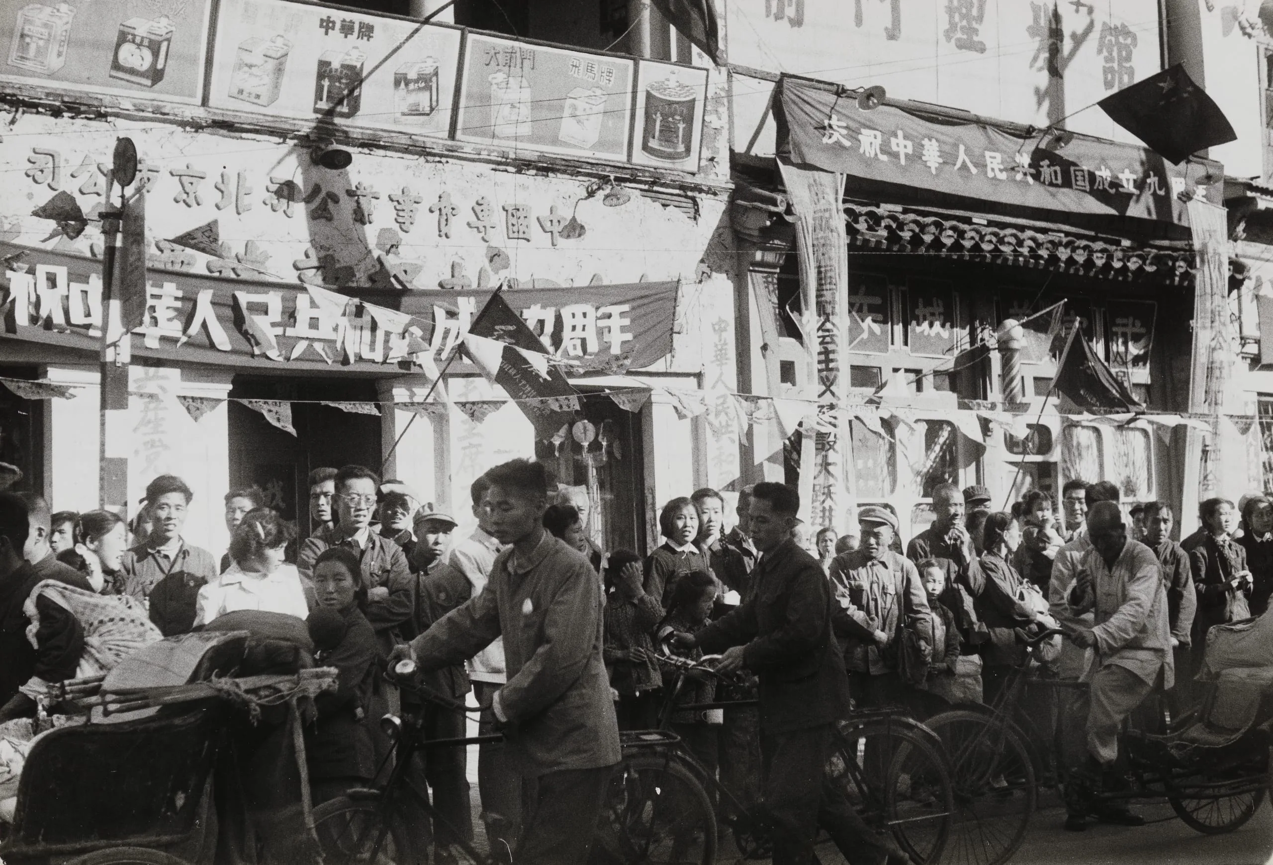 Black and white photograph of a dense street crowd in China, with pedicabs in the foreground and storefronts hung with large Chinese-character celebration banners