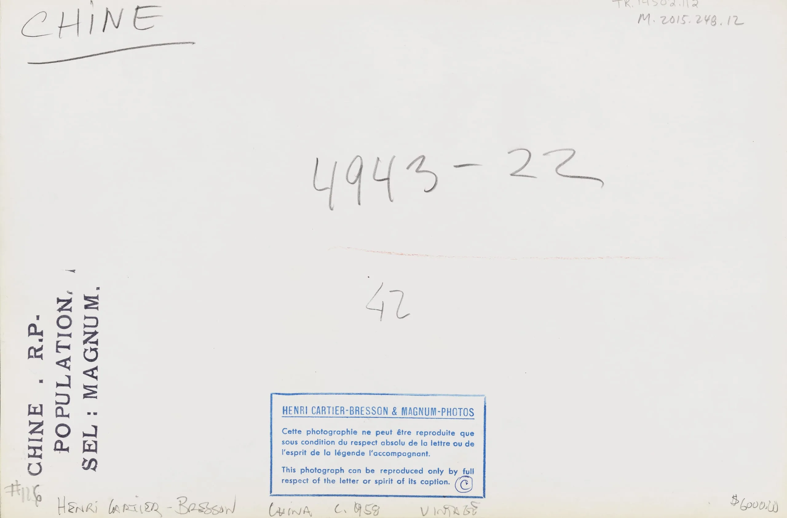 Verso of a photograph print with handwritten annotations in pencil and ink, including 'CHINE' at top left, the number '4943-22,' and a blue Henri Cartier-Bresson & Magnum Photos reproduction rights stamp.