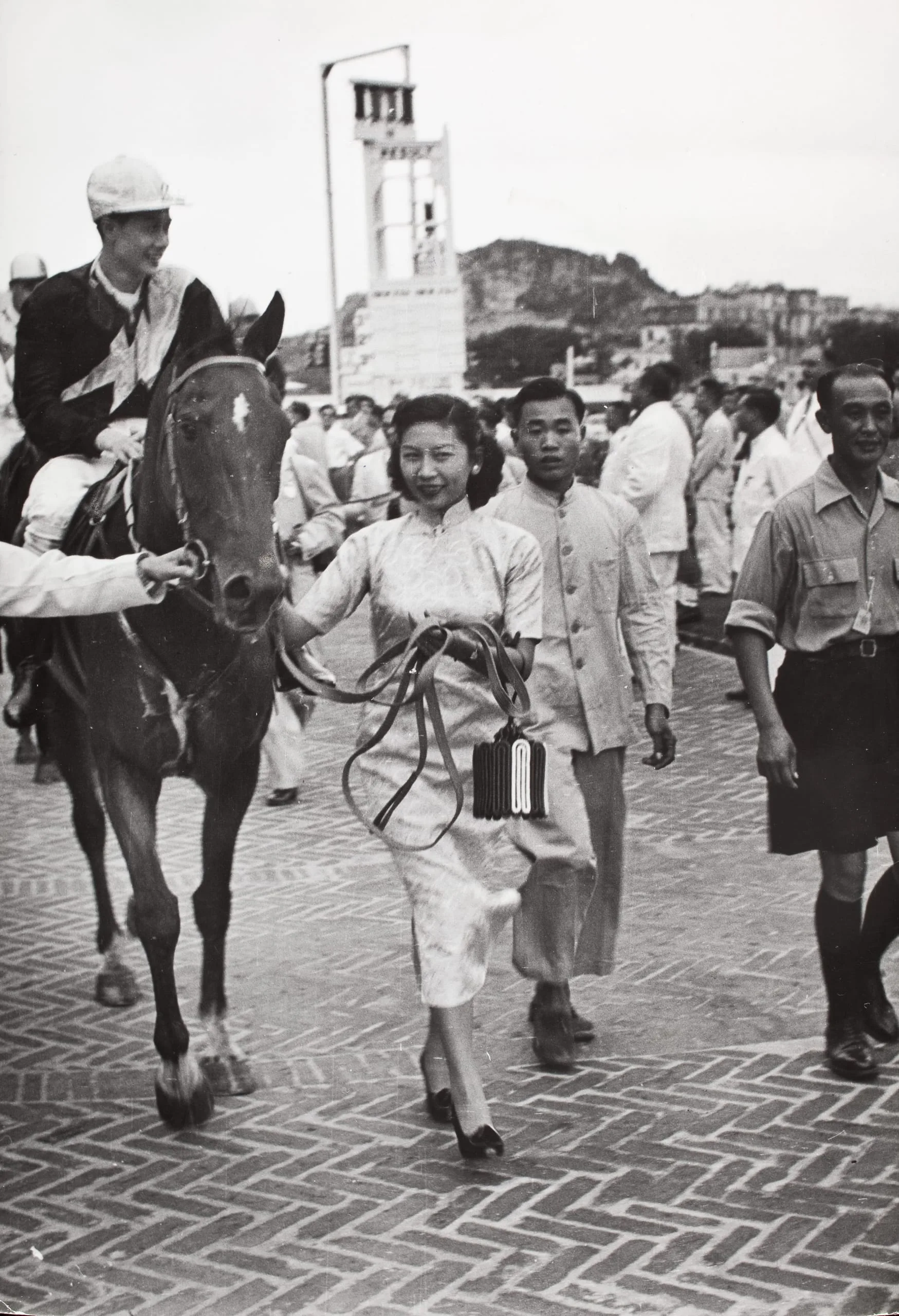 Black and white photograph of a woman in a qipao leading a horse by a strap across a brick plaza, surrounded by a crowd