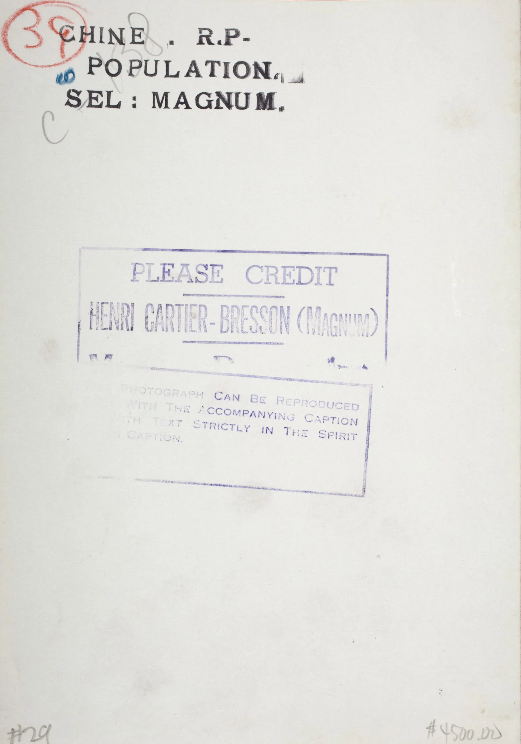 Verso of a photograph print with handwritten annotations, a red circled number, typed labels reading 'CHINE . R.P.- POPULATION. SEL: MAGNUM.', and a blue ink credit stamp for Henri Cartier-Bresson (Magnum) with reproduction instructions.