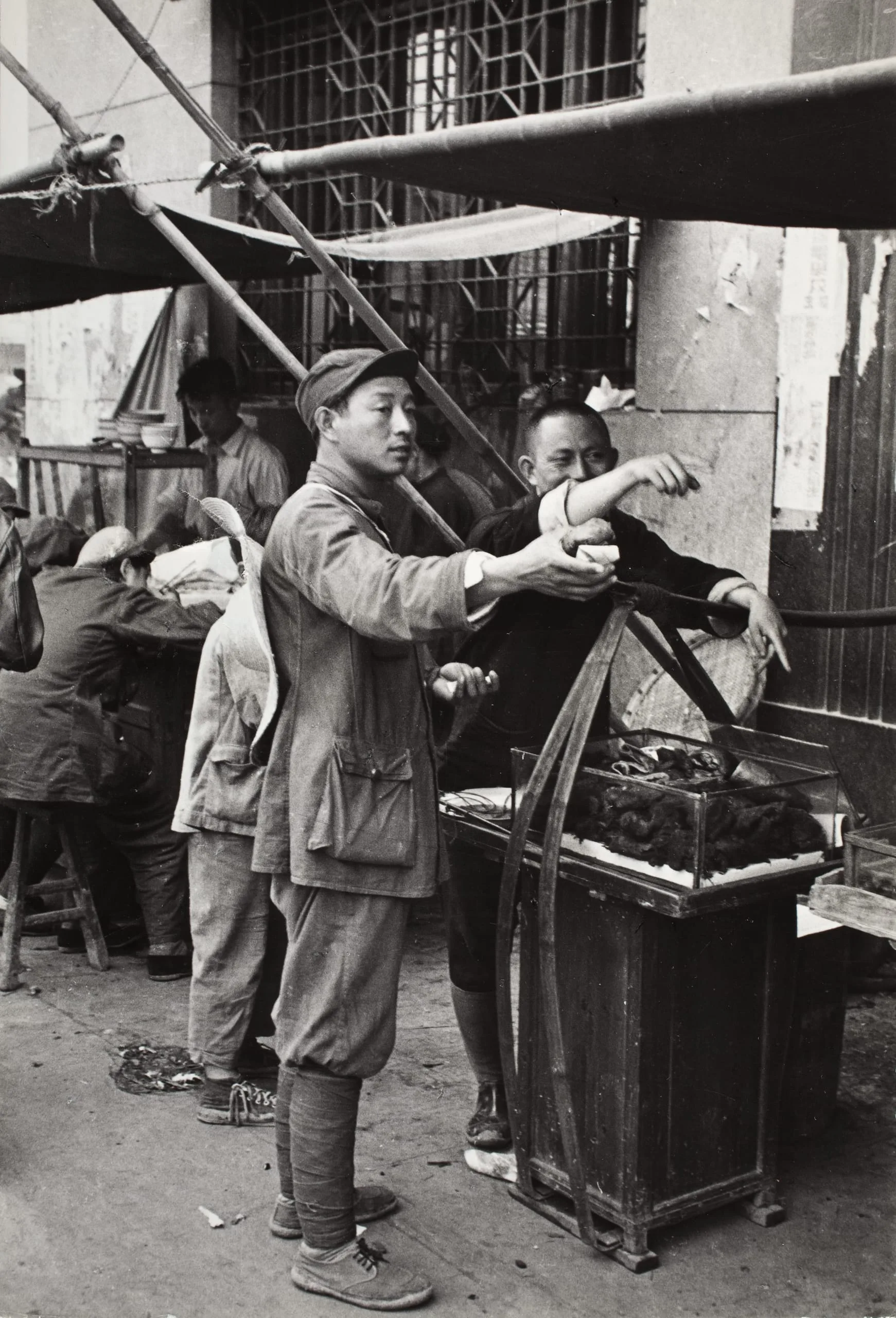 Black and white photograph of two men at an outdoor market stall, one holding an object while the other reaches forward, with a wooden cart and street scene behind them