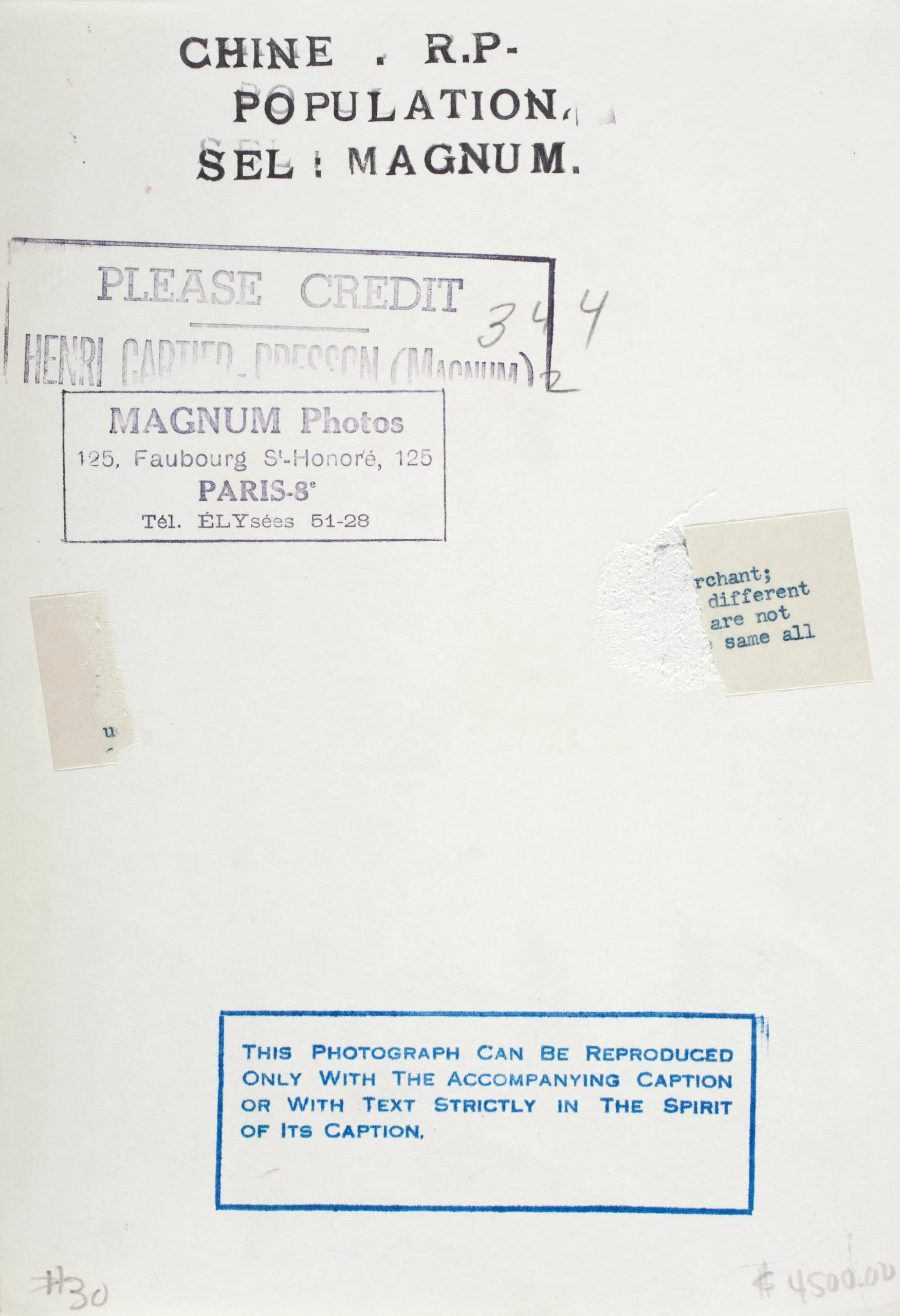 Verso of a photograph print with typed and stamped text, including a Magnum Photos agency stamp with Paris address, credit stamp, handwritten number 34, and a blue-bordered reproduction rights notice.