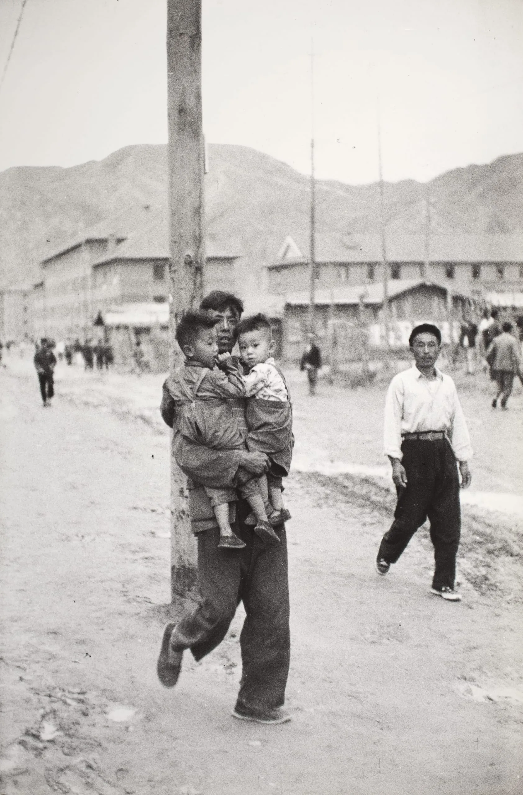 Black and white photograph of a man holding two young children while leaning against a utility pole on an unpaved street, with low buildings and mountains in the distance