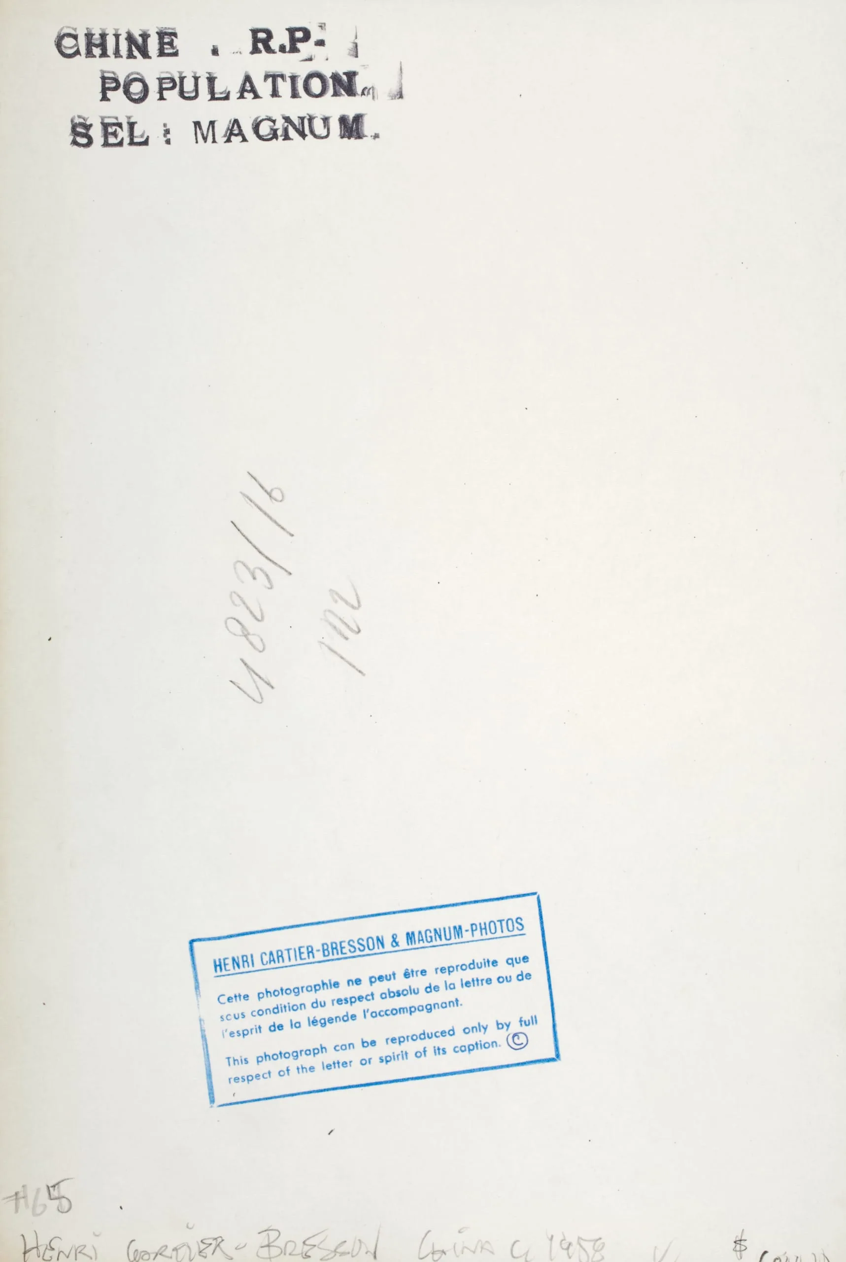 Verso of a photograph print; rubber stamps reading "CHINE R.P. POPULATION SEL: MAGNUM" at top; handwritten annotations in pencil at center; blue Henri Cartier-Bresson & Magnum Photos reproduction rights stamp at lower center; penciled inscription along bottom edge.