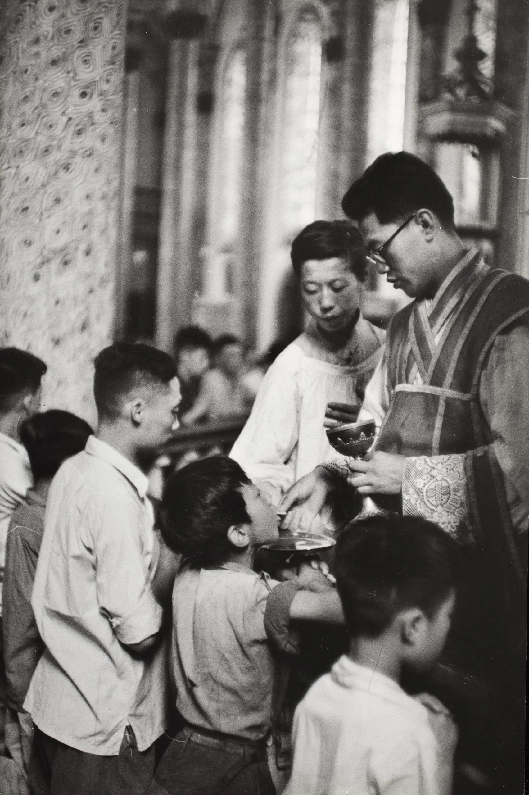 Black and white photograph of a man in liturgical vestments bending toward a group of young boys with mouths open, inside an ornate church interior